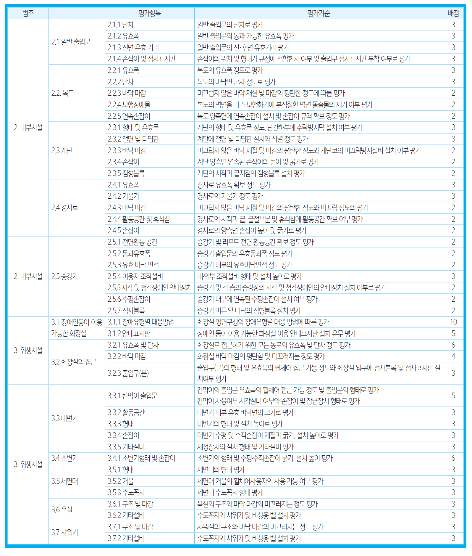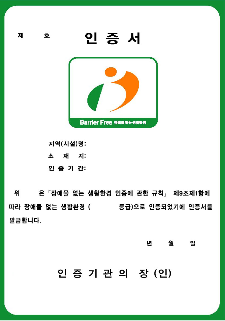 관련 근거는 ‘장애인․노인․임산부 등의 편의 증진 보장에 관한 법’, ‘교통약자의 이동 편의 증진법’, ‘장애물 없는 생활환경 인증에 관한 규칙’, ‘장애물 없는 생활환경 인증제도 시행지침’ 등이다.
