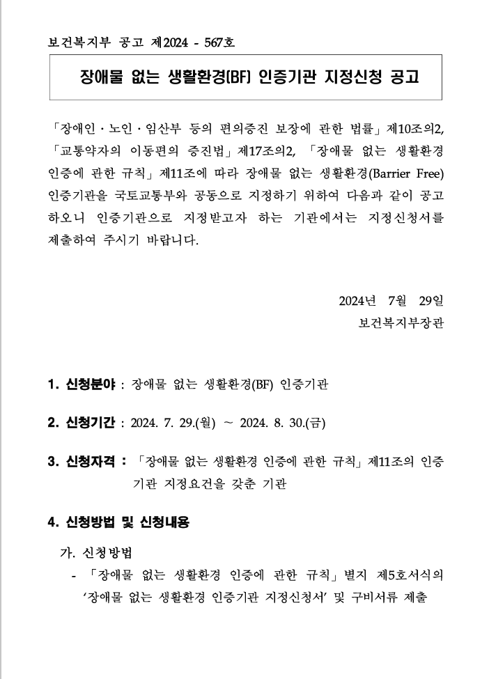 장애인, 노인, 임산부 등의 편의 증진을 위해 2008년부터 시행되고 있는 장애물 없는 생활환경(BF: Barrier Free) 인증제도가 2015년부터는 「장애인, 노인, 임산부 등의 편의 증진 보장에 관한 법률」의 개정으로 공공시설의 BF 인증이 의무화되어 전국의 대상 건축물이 대폭 증가하였다.