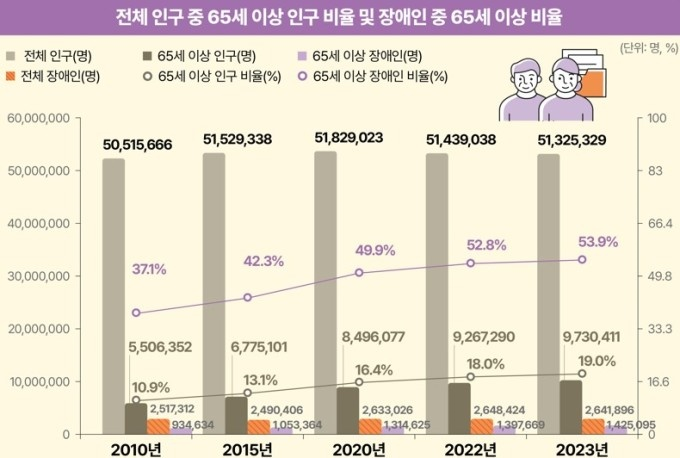 또한, 장애 인구의 증가와 후천적 장애 인구의 비율이 지속적으로 증가하고 있다. 보건복지부의 발표 자료에 따르면, 2023년 말 등록 장애인은 전체 인구의 5.1%에 해당하는 264만여 명이고, 이 중 65세 이상이 약 53.9%이며 지속적으로 증가하고 있다.