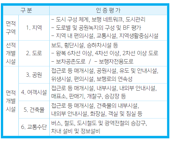 인증 대상은 개별 시설과 지역으로 구분되며, 개별 시설은 「장애인, 노인, 임산부 등의 편의 증진 보장에 관한 법」 제7조에 따른 대상 시설과 「교통약자 이동 편의 증진법」 제9조에 따른 교통수단, 여객시설, 도로이다. 지역은 교통약자의 안전하고 편리한 이동을 위하여 교통수단, 여객시설, 도로를 계획하거나 정비한 시·군·구 및 「교통약자의 이동 편의 증진법」 제15조의2에 따른 지역을 말한다.