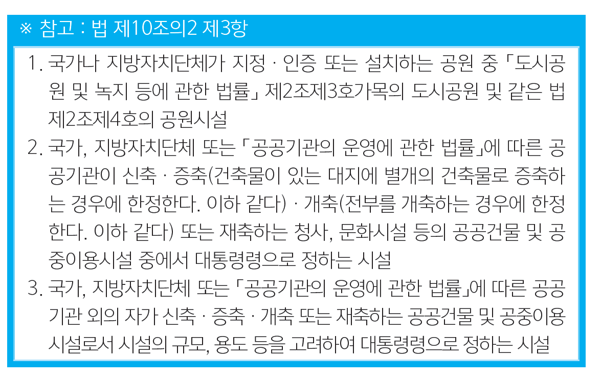 아울러, 「장애인, 노인, 임산부 등의 편의 증진 보장에 관한 법」 제10조의2 제3항에 해당하는 공원, 신축 건축물, 증축 건축물(건축물이 있는 대지에 별개의 건축물로 증축하는 경우), 개축 건축물(전부 개축하는 경우)은 의무적으로 인증을 받아야 하며, 구체적인 대상시설은 동법 시행령 별표2의2 및 별표2의3에 규정되어 있다.