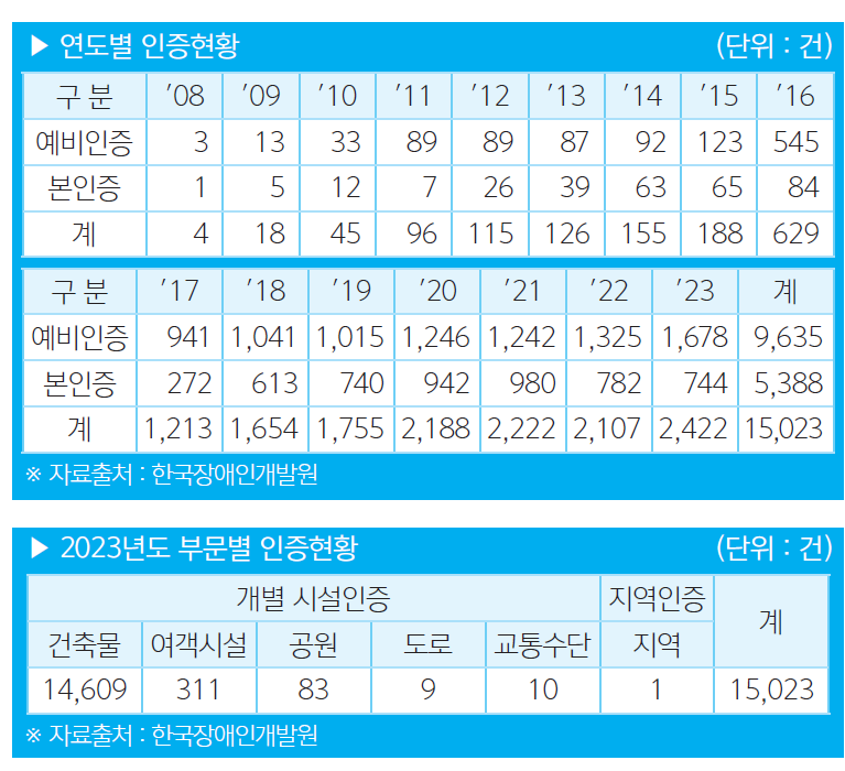 BF 인증은 2008년 제도 도입 이후, 공공시설의 인증 의무화가 시작된 2015년 이후 계속 증가하여 지난해까지 인증 현황은 총 15,023건이고, 이 중 예비 인증이 9,635건, 본 인증이 5,388건이다. 부문별 인증 현황을 보면, 전체 건수의 97.2%에 해당하는 건축물 분야가 14,609건으로 가장 많고, 이어 여객시설(311건)과 공원(83건) 순이다.