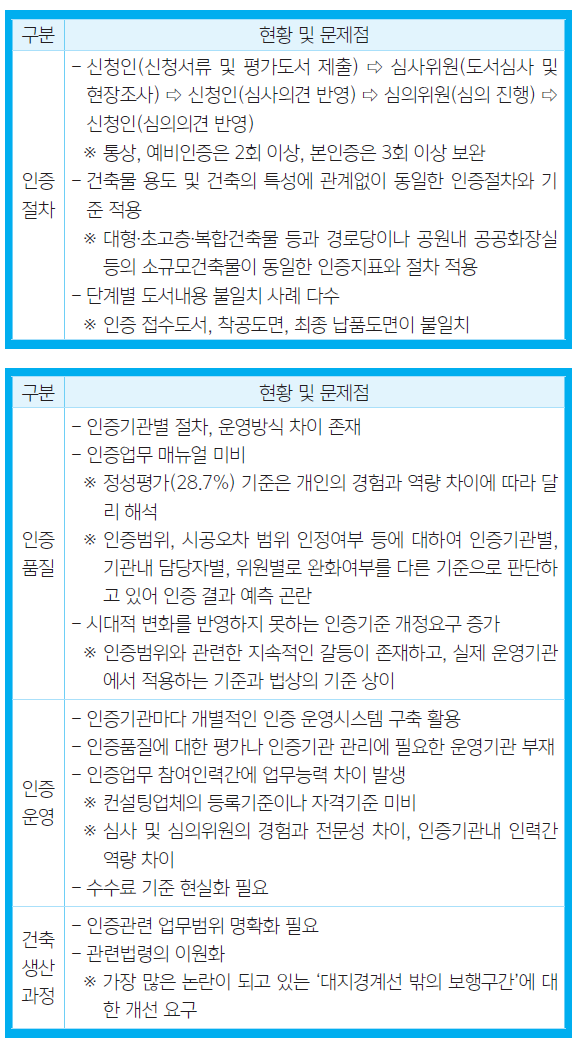 또한, 심의 기준에 있어서도 일관성이 없는 경우가 종종 발생한다. 인증기관별로 담당자들의 의견에 따라 다르게 해석되기도 하고, 심의위원에 따라 기준에도 없는 불합리한 개인 의견을 제시하거나 본인증 시 예비 인증과 다른 지적을 하여 건축사 업무 또는 건설공사 업무 수행에 혼선을 초래하기도 한다.
