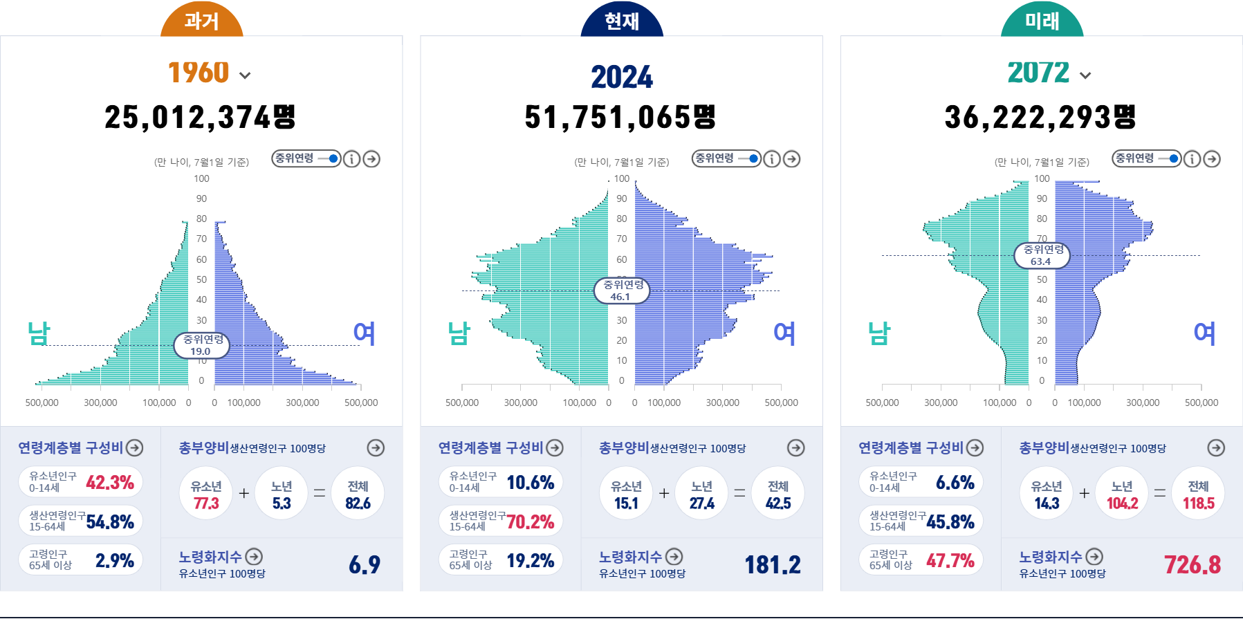 의료 기술의 발달과 공중보건의 발전, 생활 수준의 향상 등으로 노인 인구가 증가하고 평균 수명이 연장되면서 2000년 고령화 사회로 진입한 이후 급격하게 고령화되어 2026년에는 노인 인구가 전체 인구의 약 20.8%로 예상되어 초고령 사회로 진입하게 된다. 통계청 자료에 따르면, 2024년 10월 현재 우리나라 평균 기대수명은 84.3세이며, 남성은 81.4세, 여성은 89.1세이다. 또한, 65세 이상 노인 인구는 약 993만 8천 명으로 전체 인구의 19.2%이며, 올해 안에 1천만 명을 넘어설 것으로 보인다.