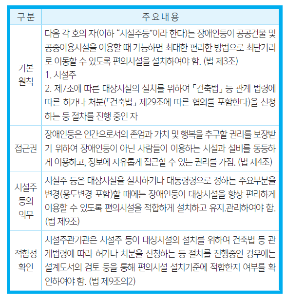 장애인 등의 삶의 질 향상을 위하여 대상 시설에 대한 이동 및 접근권을 확보할 수 있는 편의시설의 적정 설치를 유도하고, 장애인 편의 증진을 통해 사회 참여와 자립 생활을 실현하는 것을 목적으로 한다.