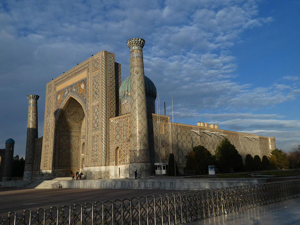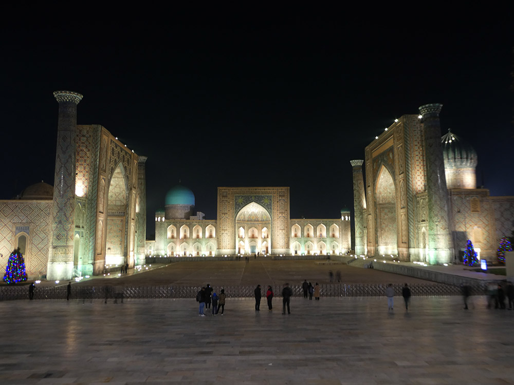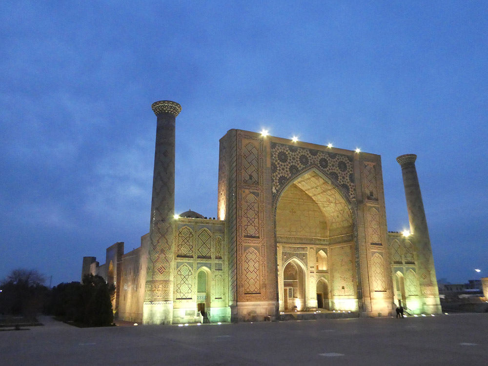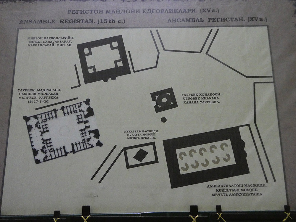 사마르칸트에는 레기스탄이란 광장이 있는데, 이는 페르시아어로 ‘모래 땅(sandy place, desert)’을 뜻하며 모래로 뒤덮인 사막이었다고 전해진다. 이 광장은 공공 광장으로 왕의 알현식, 공공 집회, 공개 처형 장소로 사용되었다고 한다. 11세기와 12세기에 사마르칸트는 이 지역의 주요 도시 중 하나가 되었고, 레기스탄 광장은 ‘세계에서 가장 고귀한 공공 광장’으로 불리며 고대 도시의 주요 예술 작품이자 심장부로 남아 있다. 티무르 제국기 (1370~1507)에 처음으로 마드라사가 건립되었다. 그 후 여러 시기에 걸쳐 페르시아 건축양식의 이슬람 교육기관이 추가로 세워져, 현재 세 개의 마드라사가 광장을 둘러싸고 있다. 이곳은 현재 유네스코 세계유산으로 지정되어 관광지로서 활발히 역할하고 있다. 이곳에는 다음과 같은 마드라사들이 있다.