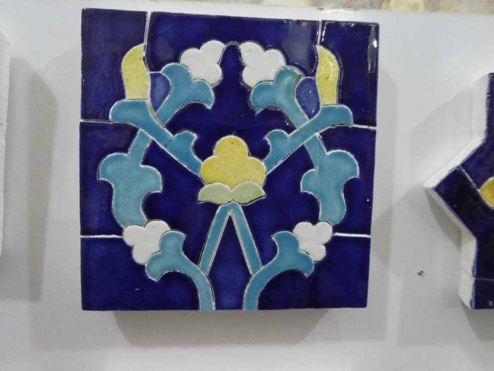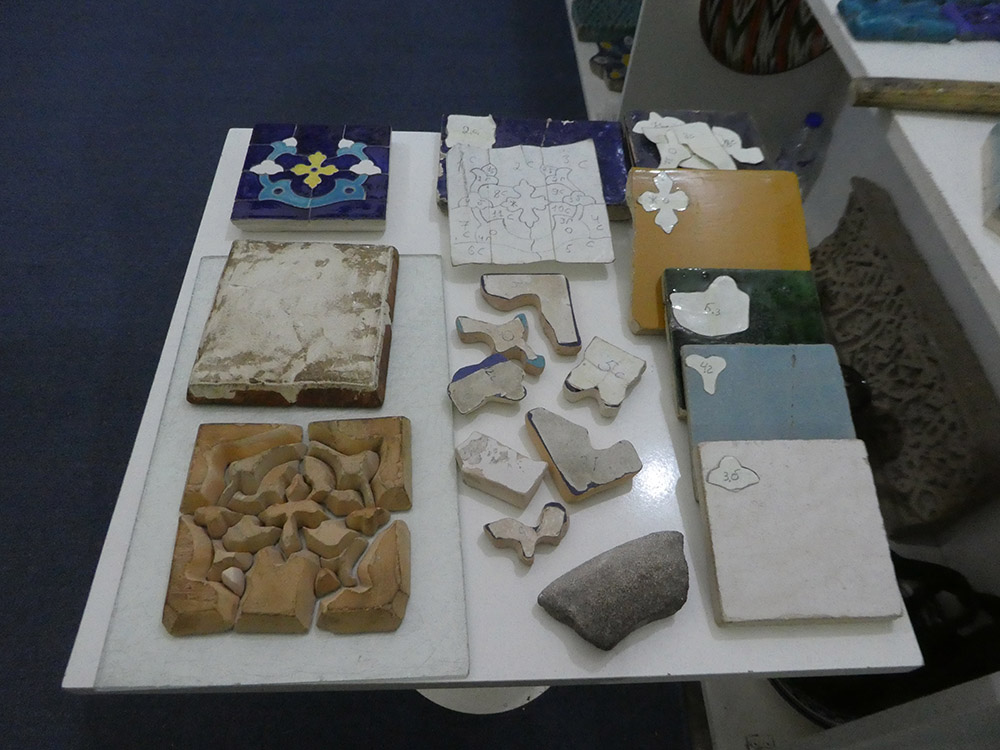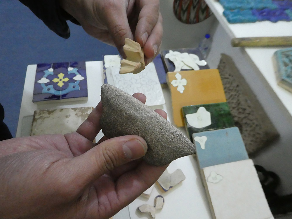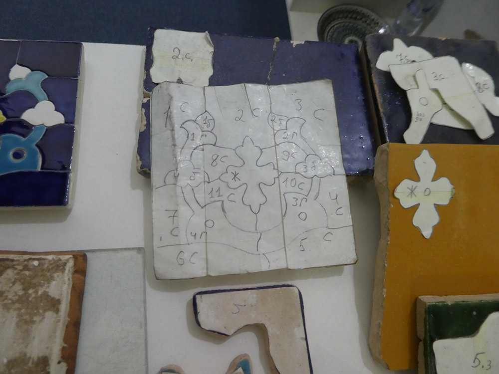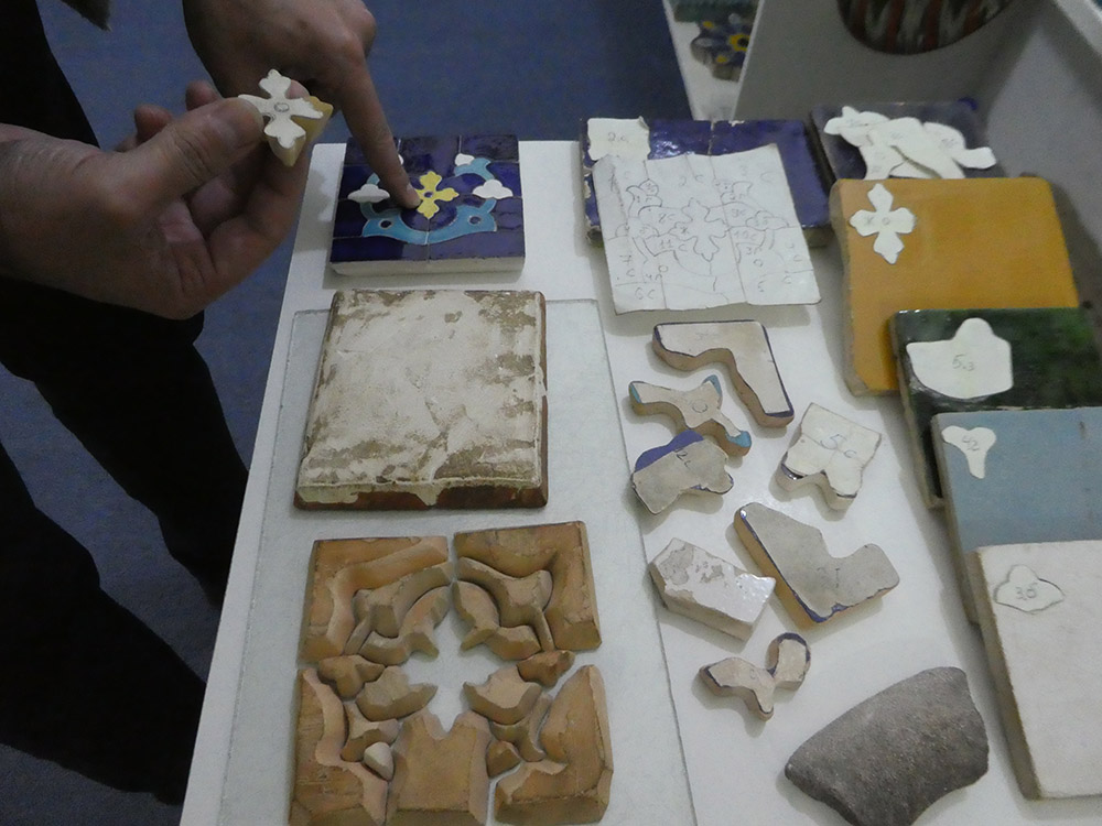 이 공간은 전통 공예품의 전시 및 판매도 겸하고 있는데, 대대로 내려오는 한 가문이 조각타일 보수에 종사한다고 한다. 참고로 이 지역의 특징인 타일 보수를 사진으로 소개한다. 다른 지역과는 달리 하나하나를 붙여서 작업한다.