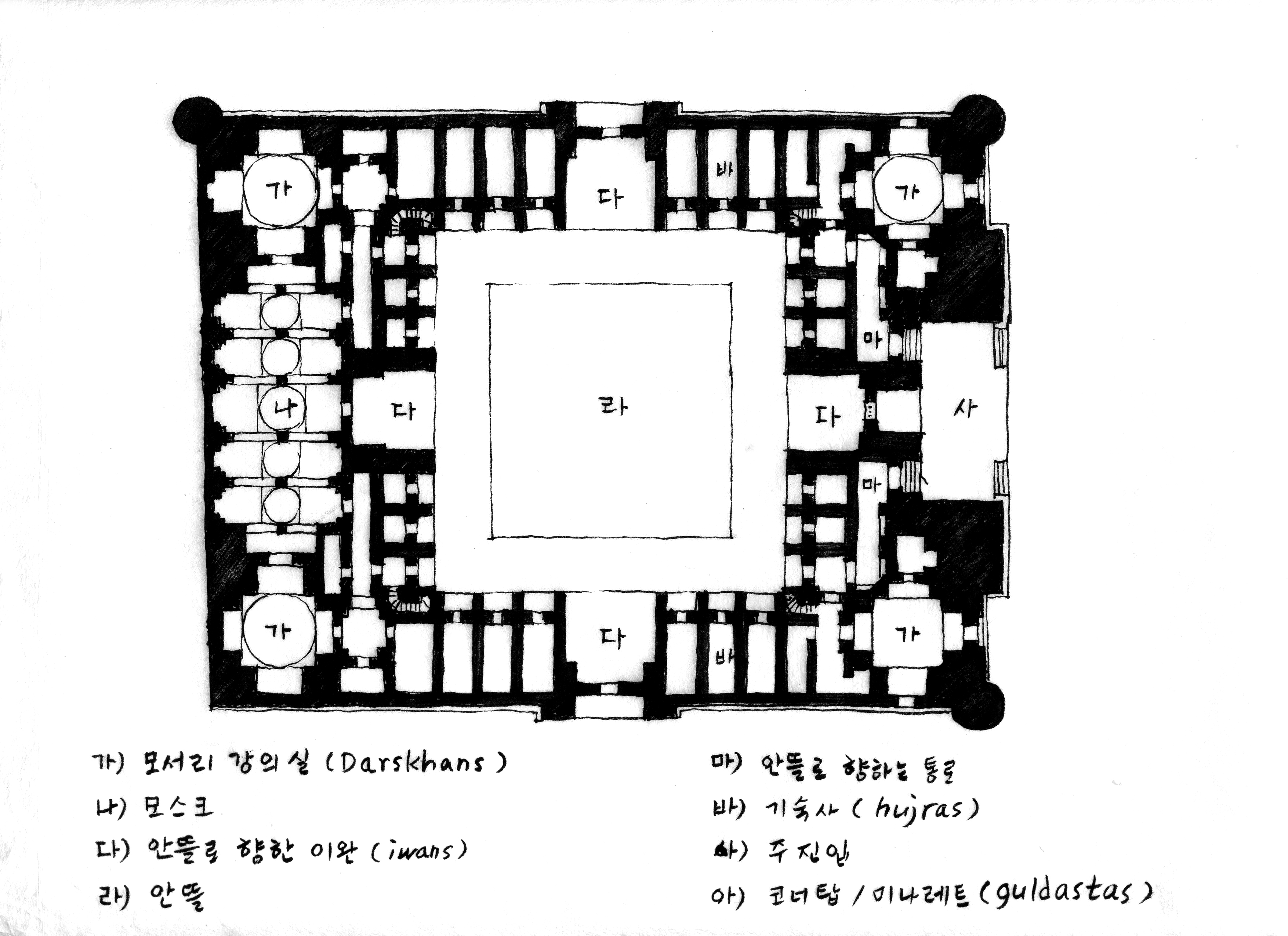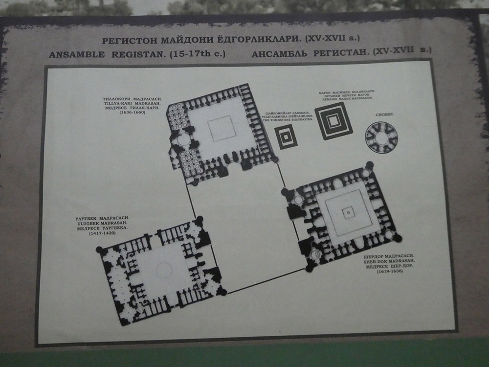 마드라사 (Madrasah)는 아랍어로 교육기관이라는 의미다. 이 광장은 공공 광장을 사이에 두고 마주 보는 구조로 세 마드라사가 배치되어 있다.