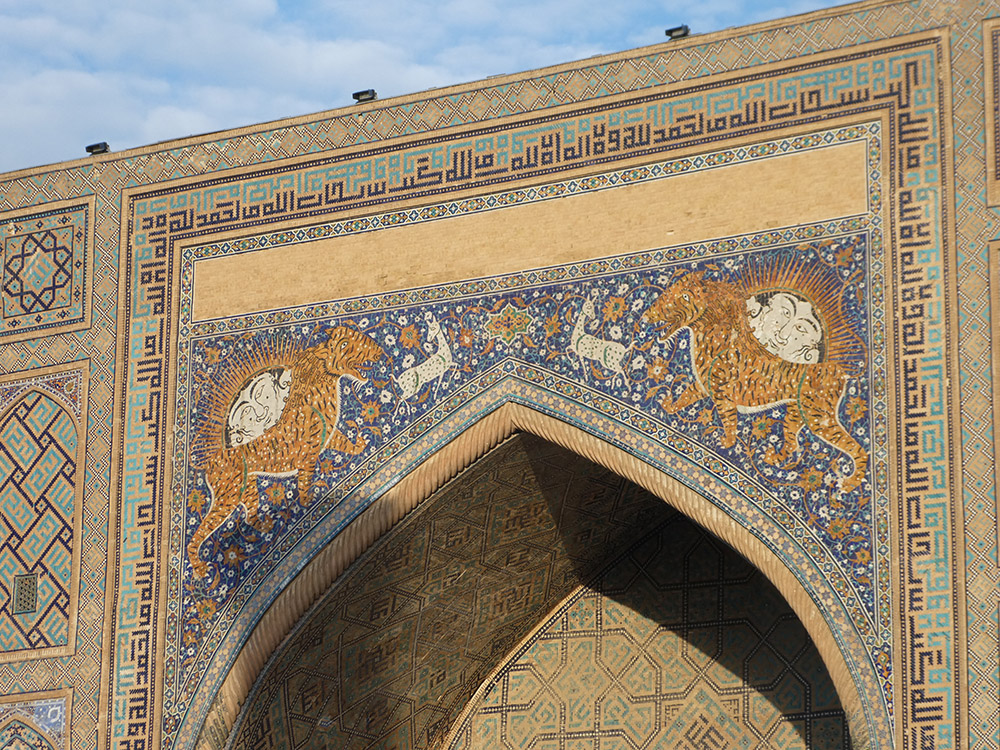 시어 도어 마드라사는 울루그 베그 마드라사와 마주보고 있으며, 17세기 사마르칸트의 총독(거버너)이었던 야한그도슈 바하도르(Yalangtoʻsh Bahodir, 1578-1656, 재위 1626-1656)의 지시로 건설됐다. 이 마드라사의 가장 독특한 특징 중 하나는 이완(Iwan) 상부에 있는 모자이크로, 의인화한 두 개의 태양과 사자의 갈기를 지닌 두 마리의 호랑이가 사슴을 쫓는 모습을 묘사하고 있다. 이러한 이유로 시어 도어(Sher-Dor)라는 이름이 붙었으며, 이는 ‘호랑이가 있다’는 뜻이다. 등에 떠오르는 태양이 있는 호랑이 모자이크는 살아있는 존재를 표현하는데, 페르시아 모티프를 사용한 점에서 흥미롭다.