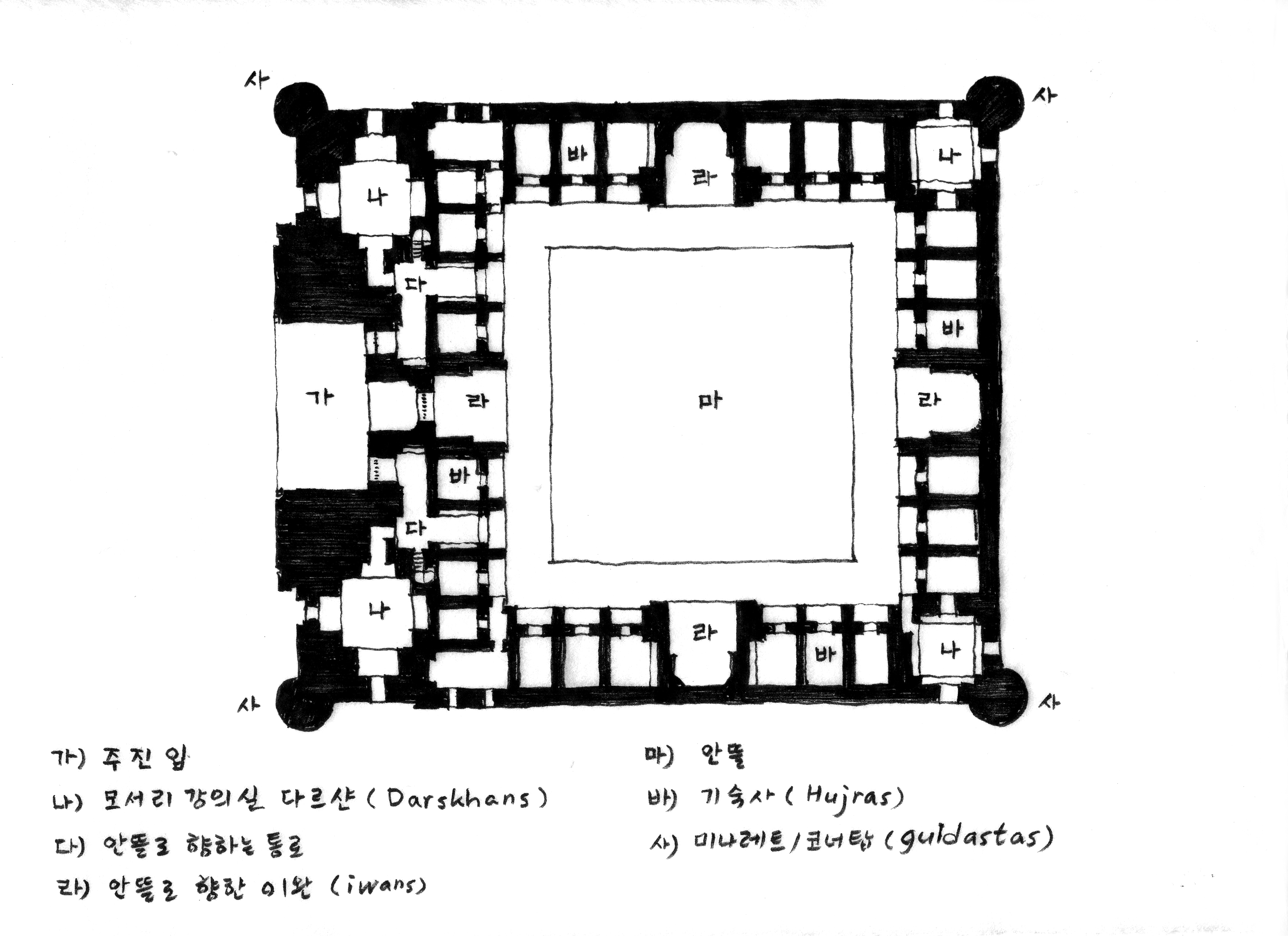 마드라사 (Madrasah)는 아랍어로 교육기관이라는 의미다. 이 광장은 공공 광장을 사이에 두고 마주 보는 구조로 세 마드라사가 배치되어 있다.
