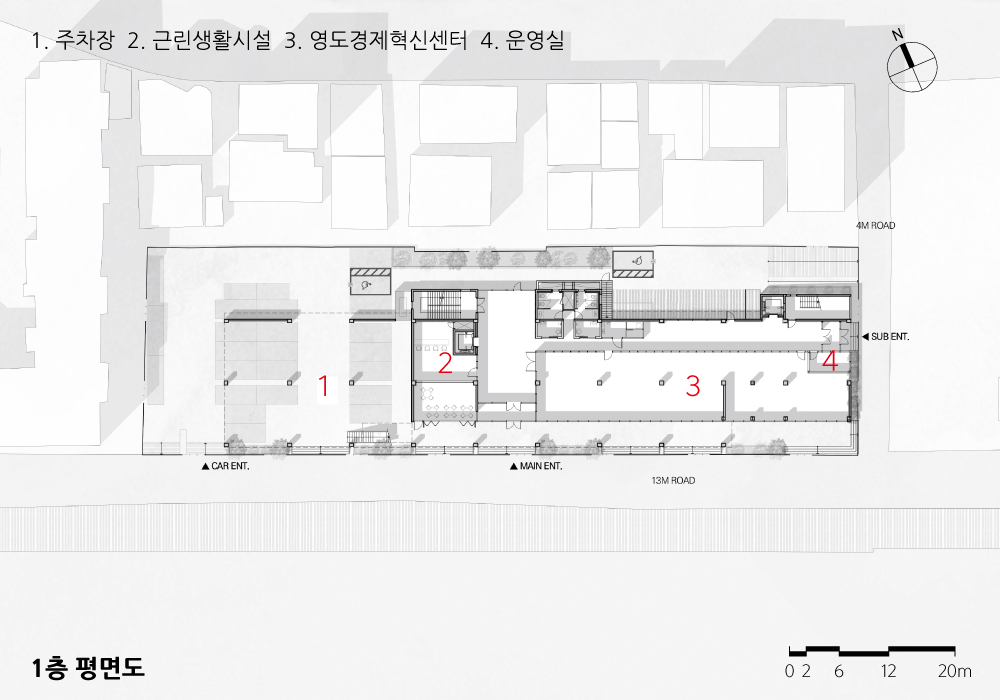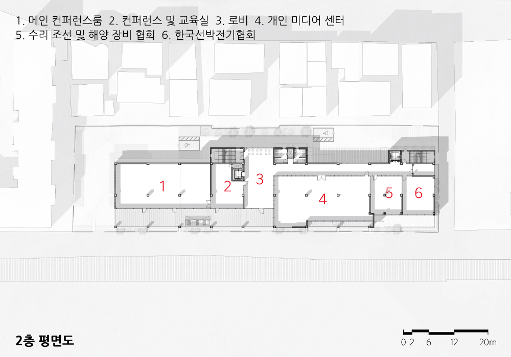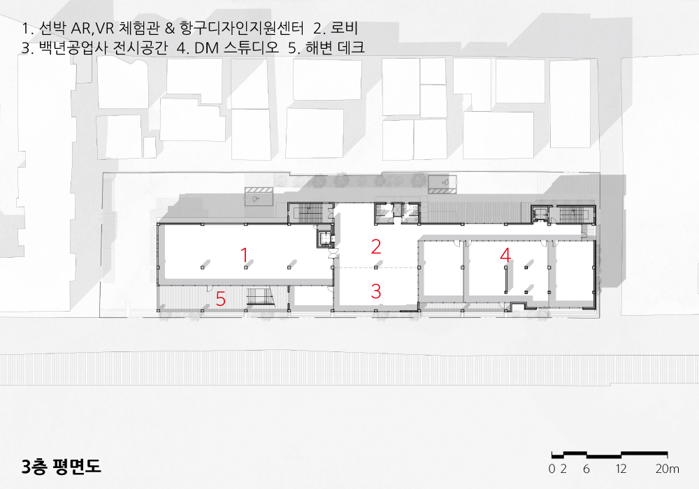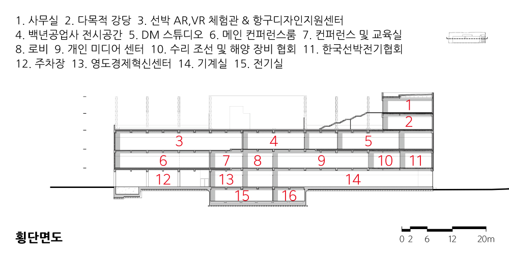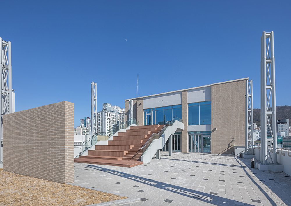 The Yeongdo Industrial Welfare Center, which is not a small size among the dense land near the shipyard in Daepyeong-dong, Yeongdo, is an architecture characterized by the outer space of an open four-story rooftop related to the sea. It also gave the role of an open yard to enjoy local festivals in Yeongdo on the 4th floor, while resting and watching the sea on the large stand connected to the 5th floor, watching movies on summer nights.