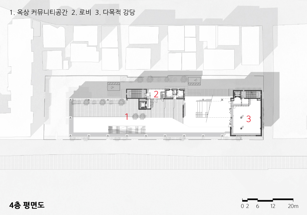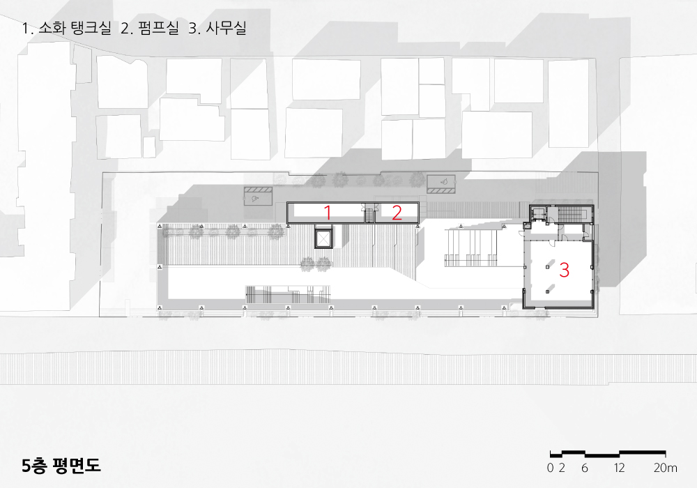 기존 건축물의 외피를 벗겨내고 테라스와 옥상으로 이동하는 외부 계단을 배치했다. 옥상은 전체 휴게공간으로 탈바꿈했다. 좁은 전면도로는 보행전용 아케이드를 구성해 1층의 접근성을 높이고, 1·2·3층은 테라스와 아케이드를 가진 열린 파사드로 디자인했다. 건물 우측의 5개 층 형태는 수평의 열린 파사드와 대비되는 콘크리트 블록의 간결한 매스로 디자인하여 주도로에서 진입 시 건축물의 상징성을 고려했다.