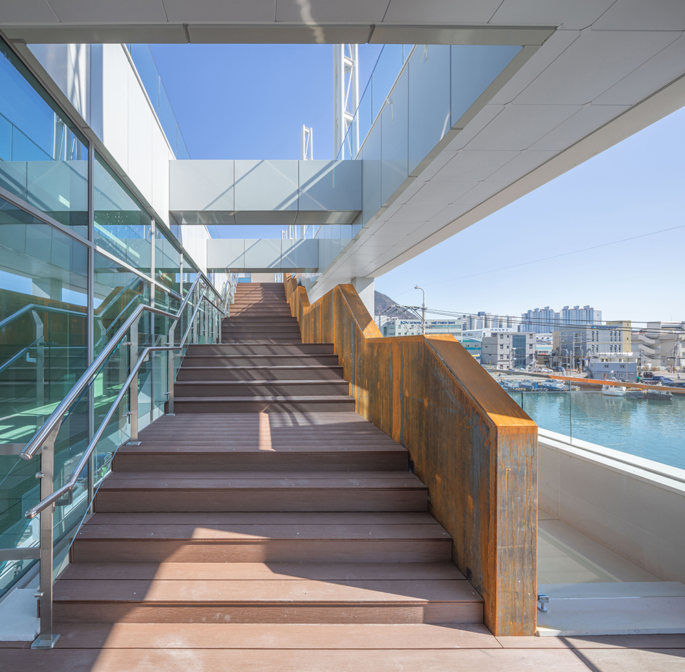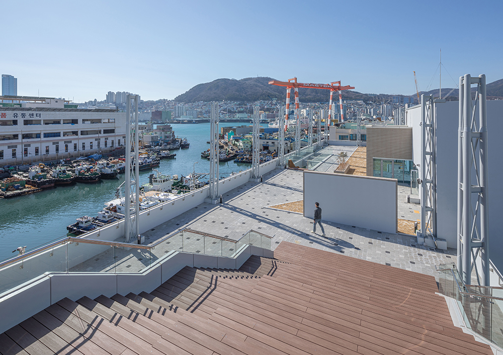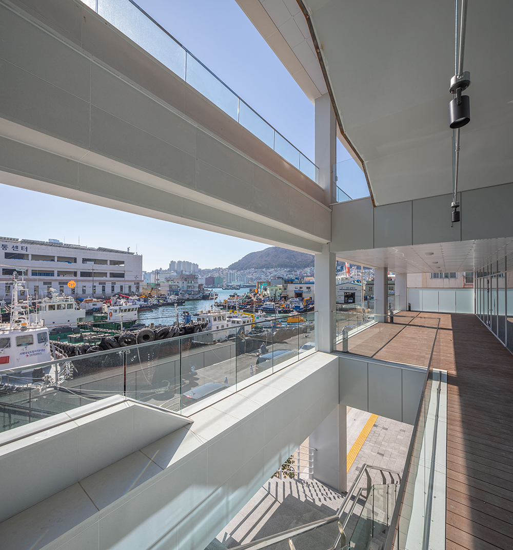The open facade with a terrace of the Yeongdo Local Industry Welfare Center seen from opposite Gulhang Port expressed that the designed public space of public buildings is leisurely related to the sea.