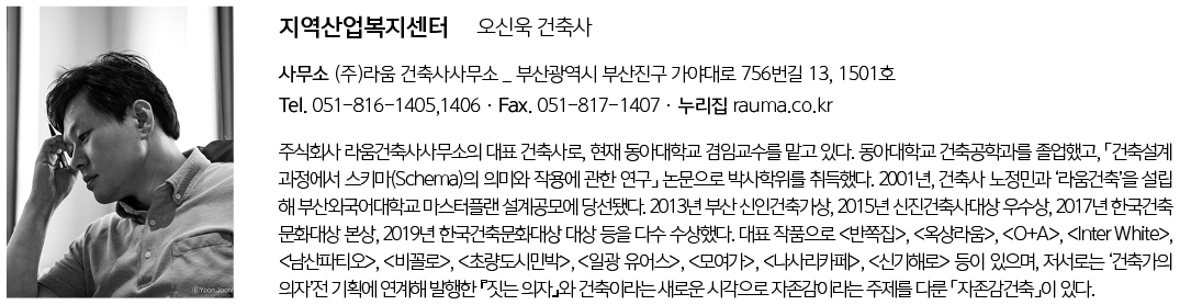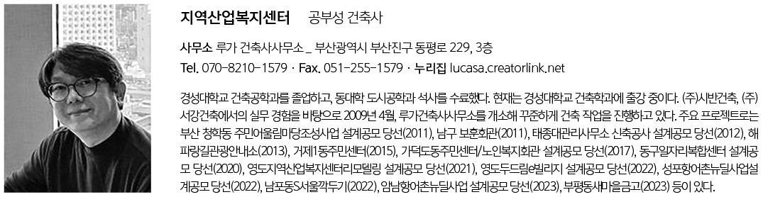 | 지역산업복지센터 설계자 | 오신욱 _ (주)라움 건축사사무소, 공부성_ 루가 건축사사무소 건축주 | 부산광역시 감리자 | 건축사사무소 한가람 시공사 | 용신종합건설(주) 설계팀 | 라움 _ 노정민, 안신, 천지연, 최유진, 김예나, 고은지 루가 _ 윤수호, 김무준, 정유석, 정승재, 김현정 설계의도 구현 | (주)라움 건축사사무소, 루가 건축사사무소 대지위치 | 부산광역시 영도구 대평동 1가 80 외 2필지 주요용도 | 업무시설, 근린생활시설(휴게음식점) 대지면적 | 2,173.90㎡ 건축면적 | 1,255.05㎡ 연면적 | 3,792.28㎡ 건폐율 | 57.73% 용적률 | 165.77% 규모 | B1F - 5F 구조 | 철근콘크리트구조, 철골구조 외부마감재 | 라임스톤, 큐블럭, 스타코 내부마감재 | 고흥석버너구이, 수성페인트, 합성목재데크 설계기간 | 2021. 06 - 2021. 12 공사기간 | 2021. 12 - 2023. 01 사진 | 윤준환 구조분야 | 조은구조이앤씨(주) 기계설비분야 | (주)신흥이앤지 전기통신·소방분야 | (주)여명기술단 |