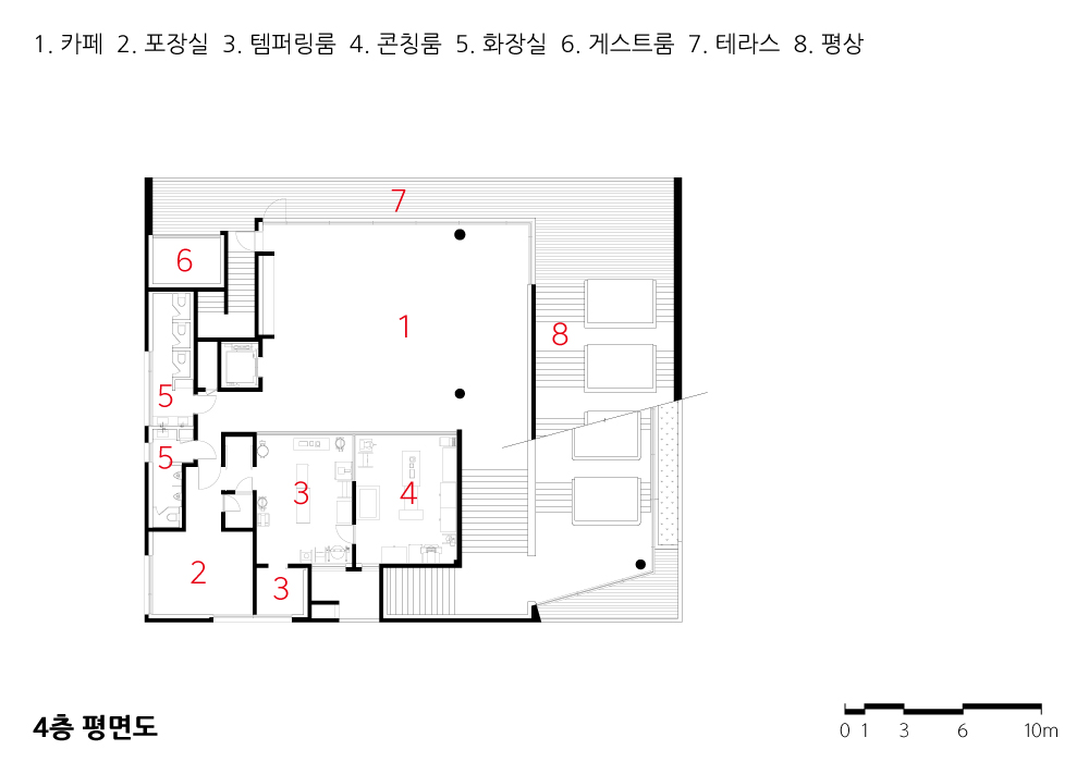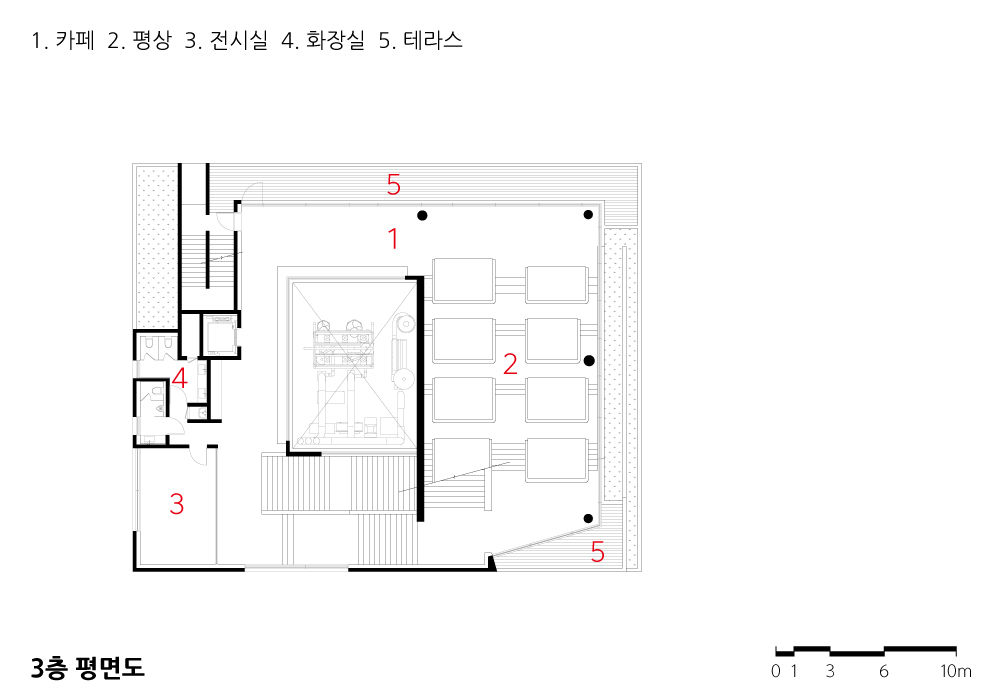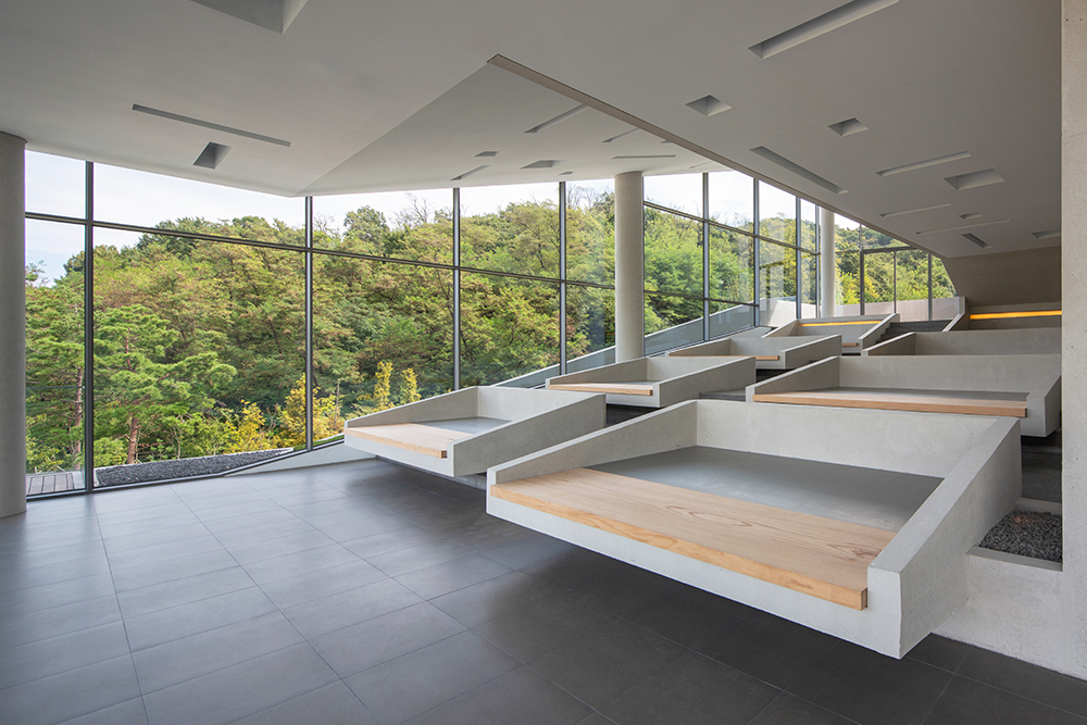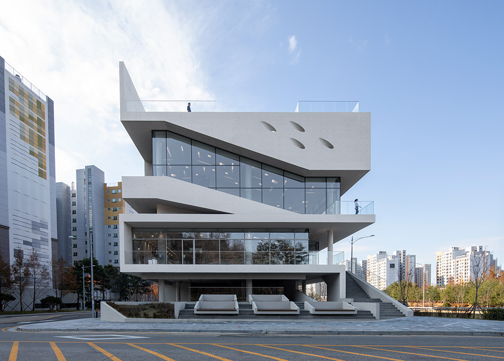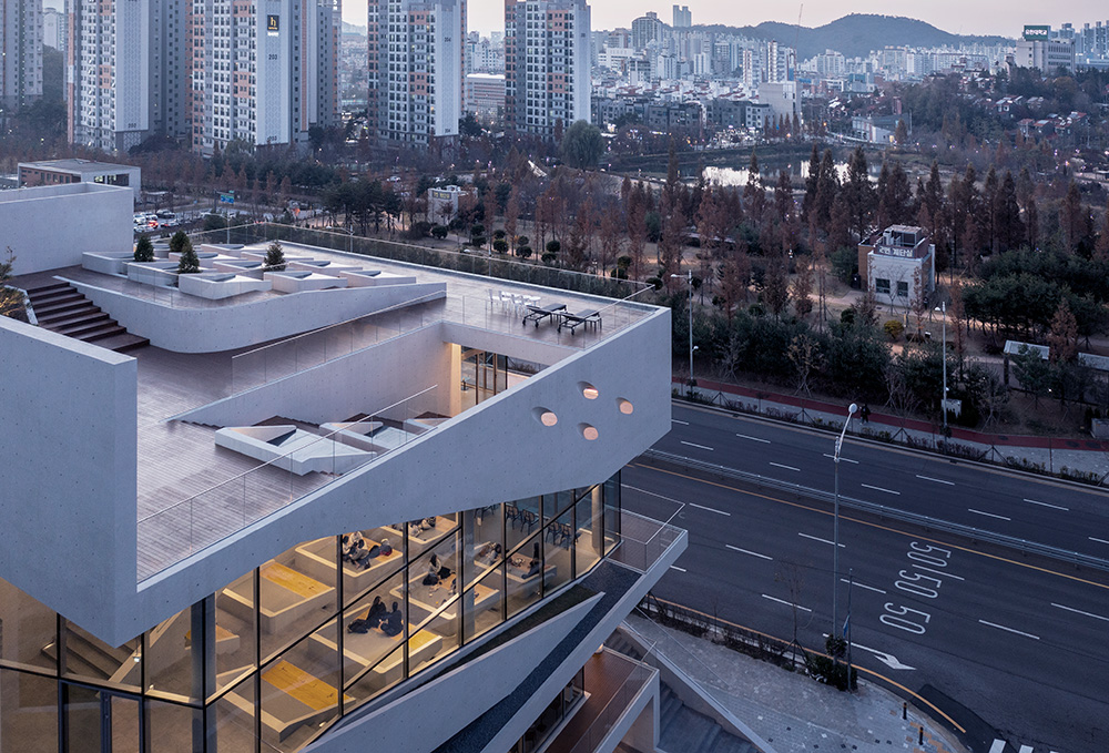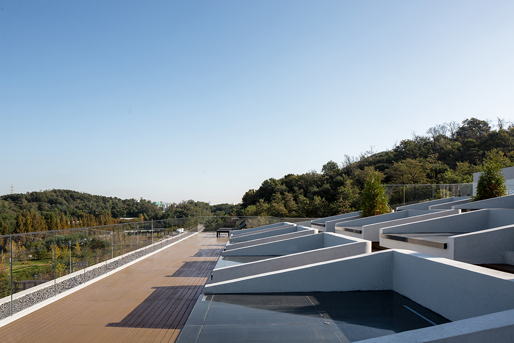 The term 9ro-Pyeongsang reflects the design where all floors resemble “pyeongsang” stands, a traditional form of Korean seating furniture. The expansive views of the urban park, which is three times the size of Bryant Park, provide an ideal setting for an architecture that emphasizes panoramic vistas. Elements such as the ground-level communal courtyard, the pyeongsang stands connecting the third and fourth floors, the external stairs linking the fourth floor and rooftop, and the rooftop pyeongsang ensure vertical continuity and create varied viewing points. The traditional pyeongsang has been reinterpreted as concrete furniture integrated into the building, corresponding to the viewing programs on each level. The ondol (heated) pyeongsang on the fourth-floor outdoor space and rooftop addresses the seasonal constraints of Korea, allowing users to share warmth with the structure.