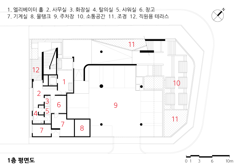 | 9로평상 설계자 | 곽희수 _ (주)이뎀 건축사사무소 건축주 | 주식회사코이너스인터내셔날 감리자 | (주)이뎀 건축사사무소 시공사 | (주)제효 대지위치 | 서울특별시 구로구 서해안로 2134 주요용도 | 제2종근린생활시설(일반음식점) 대지면적 | 1,045.20㎡ 건축면적 | 613.20㎡ 연면적 | 1,486.24㎡ 건폐율 | 58.67% 용적률 | 142.20% 규모 | 4F 구조 | 철근콘크리트구조 외부마감재 | 노출콘크리트 내부마감재 | 노출콘크리트, 도장 설계기간 | 2020. 11 – 2022. 01 공사기간 | 2022. 01 – 2023. 10 사진 | 김재윤 구조분야 | SDM구조기술사사무소 기계설비분야 | 두현엠앤씨 전기분야 | 청우이엔지 |