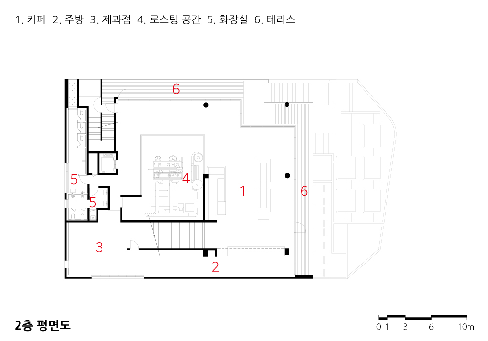 커피사업으로 가업을 잇는 클라이언트는 공장과 매장이 공존할 수 있는 카페를 의뢰했다. 두 영역은 기계로 채워지는 공장과 테이블 중심의 소비 영역으로 구성된다. 건축의 주안점은 성분이 다른 두 영역 간 개별 독립성과 상호보완적 관계를 모색하고, 방문자에게 흥미롭고 새로운 공간 경험을 유도하는 것이다.