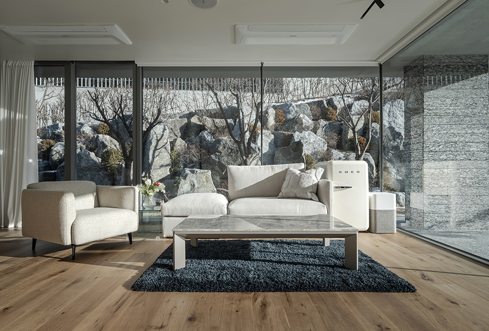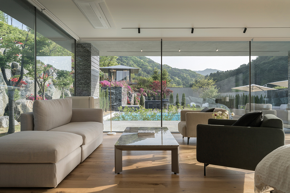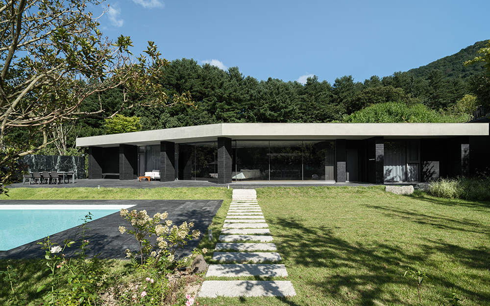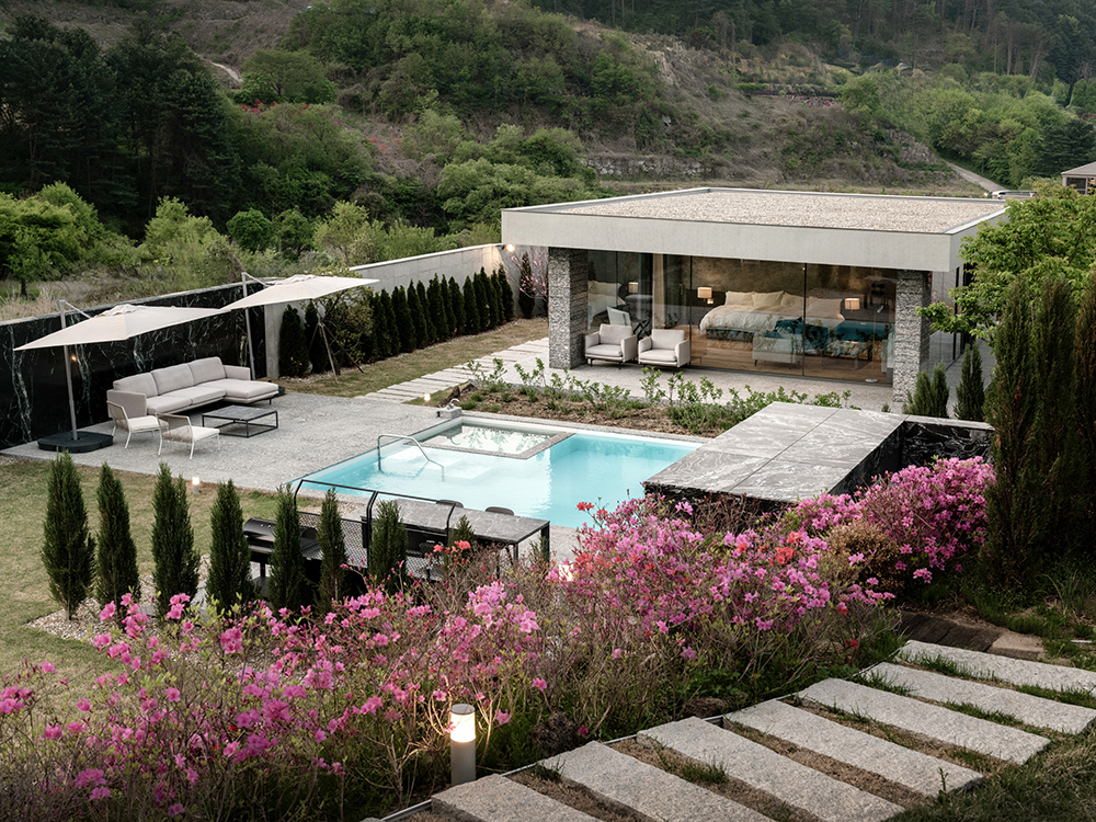 A동 _ 과거 건물을 리모델링했다. 전체 마스터플랜의 계획에 맞게 수영장을 비롯한 외부 공간과 기존 건축물의 접근 경로(동선)를 새로이 계획했고, 내부 인테리어 전체를 재구성했다. B동과의 시·지각적인 분리를 위해 경계에 자작나무 숲을 구성했다. 또 도로 및 인접대지와의 분리를 위해 옹벽과 담장을 계획했다.