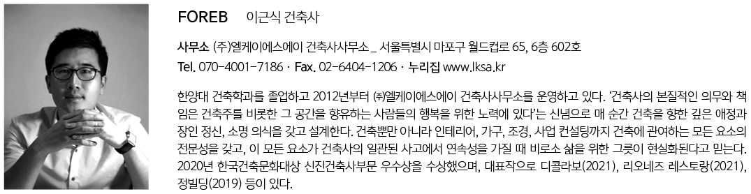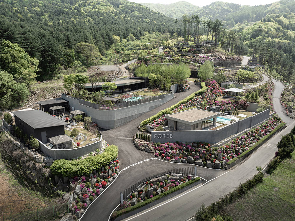 Situated on a hillside in Gapyeong, the FOREB project involves the design of four residences intended for rural lodging. Spanning approximately 5,000 square meters (around 1,500 pyeong), the project encompassed civil engineering, architecture, interior design, landscaping, furniture, and program planning. It reflects a three-generational journey: the father who acquired the land, the son who sowed the seeds, and the grandson who nurtures it with water and light, sharing the fruits of their labor. Concepts like horizon, levitation, walls, boundaries, architectural outdoor spaces, enclosure, womb-like spaces, levels, proportions, openness and closure, volume, solidity, landscape curation, restraint, serenity, tranquility, and promenade guided the design process.