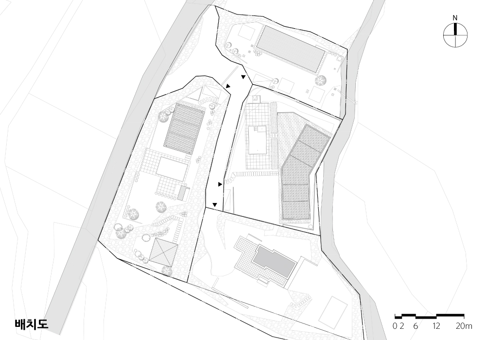 전체 부지를 4단계의 다른 레벨로 조성해, 주변을 둘러싼 붉게 물든 화살나무 물결 너머로 너울거리는 잣나무 숲의 푸른 일렁임을 온 대지에서 누릴 수 있도록, 시선이 상호 간섭되지 않도록 계획했다. 동 간에는 프라이버시가 침해되지 않도록 건축의 외부 공간 구성과 조경을 계획했다. 또한 모든 4개의 부지가 서로 긴밀하게 연결되도록 소로와 계단 등으로 긴 산책길을 마련했다. 다양한 레벨과 방향, 조경과 질감의 시간에 따른 변화를 통해 자연과 다양한 밀도와 강도로 조우하게 된다. 전체 대지를 향유하는 이들이 깊은 추억의 시간을 만들 수 있기를 바란다.