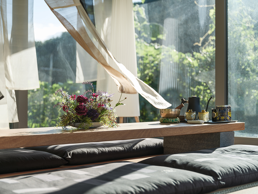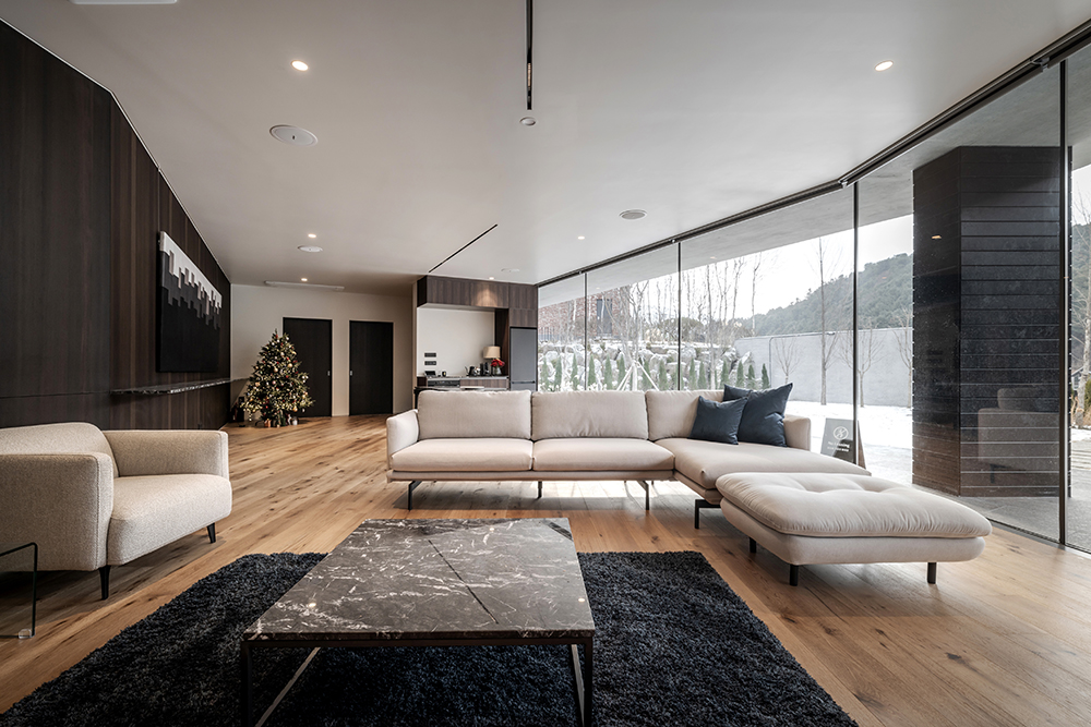 Building B _ Building B was designed with the metaphor of a small boat floating serenely on a calm horizon, evoking the gentle flutter of a bird navigating a dense forest. To emphasize its quiet presence, the design features a floating, single mass. The façade incorporates recessed sections to cast shadows, and the building is finished with dark stone, accentuating a sense of weightlessness. The interplay between indoor and outdoor spaces was designed to minimize the differences at the boundaries, extending the senses seamlessly across window frames, ceilings, and floors.