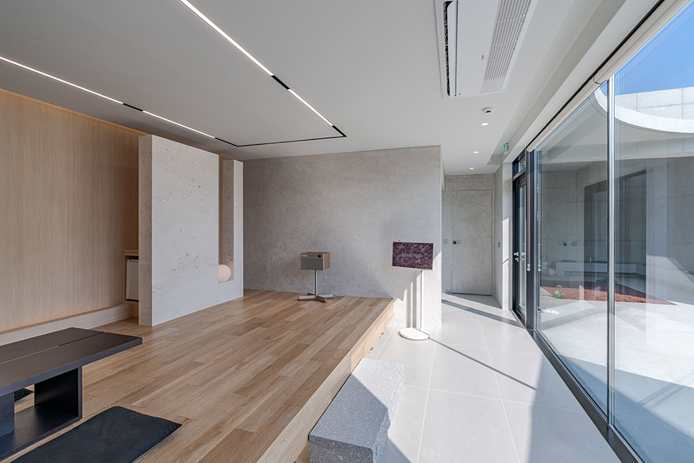 Just as the gently revolving arc wall protects the right of separation and gaze, it will add the comfort of a cozy interior space and embrace the family’s daily space. To re-understand human habitation……. Rather than simply creating a space with function, beauty, and shelter, we hope to create a truly happy family space by flexibly responding to the surrounding environment.