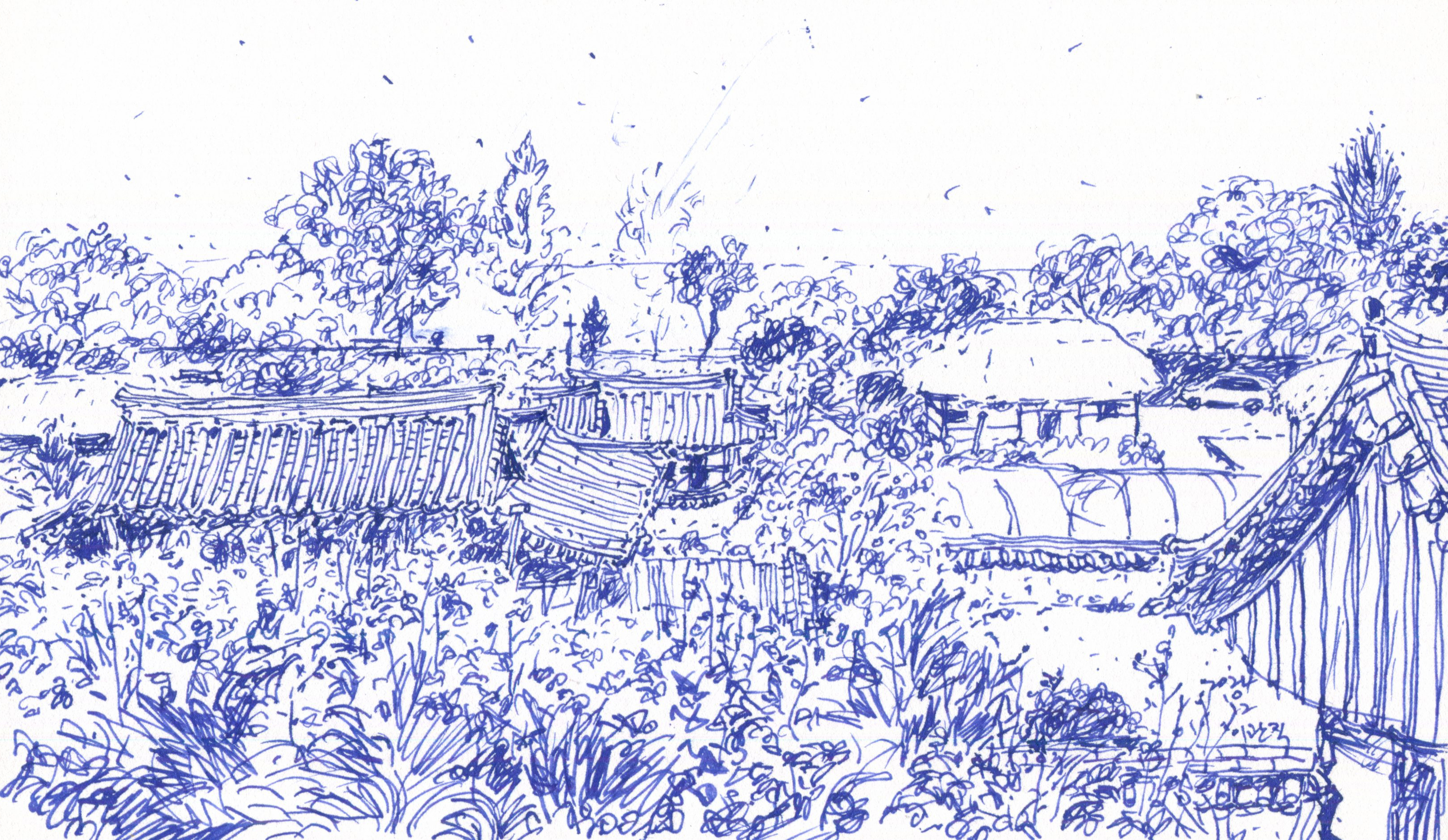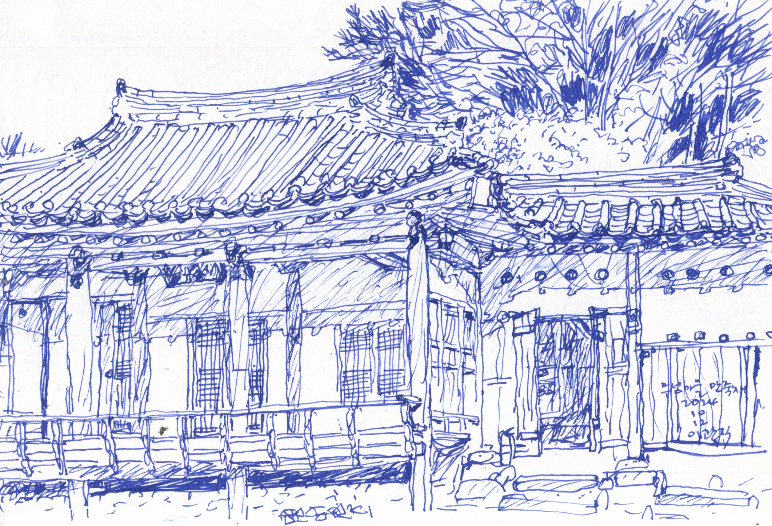 영주역이 KTX역으로 바뀌고 서울에서 두 시간 걸린다. 20여 년 전 경륜훈련원 설계로 현장을 오려면 하루 종일 걸렸다. 무섬마을은 영주역에서 승용차로 20분, 비교적 가까운 거리에 있다. 무섬은 물에 떠있는 섬이라는 뜻으로 수도리(水島里)의 우리말이다. 낙동강의 지류인 내성천이 뱀처럼 둥글게 휘돌면서 섬 모습으로 고립된 곳에 1666년 처음 집을 지어 마을이 형성되었다고 한다. 마을 여러 곳이 한옥 숙소로 운영되고 있다. 박제된 여느 민속촌과는 다르게 무섬마을은 주민도 거주하고 살림 냄새가 난다. 가장 오래된 집인 만죽재에서 모임을 가졌다. 집에서 조금 떨어져 있는 전망 좋은 별채에서 묵었다. 아침에 일어나 남쪽으로 난 문을 여니 쪽마루, 계자난간 너머 안갯속에 마을이 내려다보인다. 안개 때문에 외나무다리는 보이지 않는다. 기분 좋게 아침 스케치를 한다.