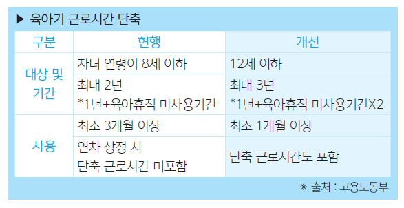 (개선) 육아기 근로시간 단축 대상 자녀의 연령을 만 12세 이하 또는 초등학교 6학년 이하로 확대하고, 육아휴직 미사용기간은 두 배 가산하여 육아기 근로시간 단축에 사용할 수 있게 된다. 따라서, 육아휴직을 사용하지 않은 경우 육아기 근로시간 단축을 최대 3년까지 사용할 수 있다. 현재 3개월인 최소 사용단위기간도 1개월로 단축하여 방학 등 단기적 돌봄 수요에도 사용할 수 있게 된다.