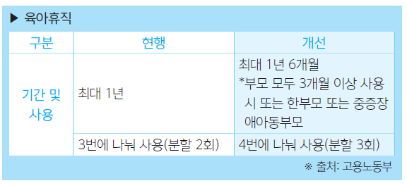 (개선) 부모 맞돌봄 확산을 위해 부모가 각각 육아휴직을 3개월 이상 사용하는 경우와 한부모 또는 중증 장애아동의 부모는 육아휴직을 기존 1년에서 6개월 연장하여 1년 6개월로 사용할 수 있다. 또한, 육아휴직을 필요에 따라 3회 분할하여 네 번에 나누어 사용할 수 있게 된다.
