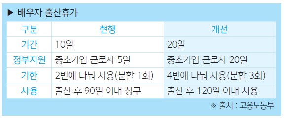 (개선) 아이가 태어나면 적어도 한 달은 산모와 신생아를 돌볼 수 있도록 배우자 출산휴가를 10일에서 20일로 확대하고, 우선지원대상기업 근로자에 대해서는 정부의 급여지원 기간도 5일에서 20일로 확대한다. 또한, 출산 후 90일 이내 청구하던 것을 120일 이내 사용할 수 있도록 사용기한을 확대하고, 최대 네 번까지 나누어 사용할 수 있도록 사용 편의성도 강화한다.