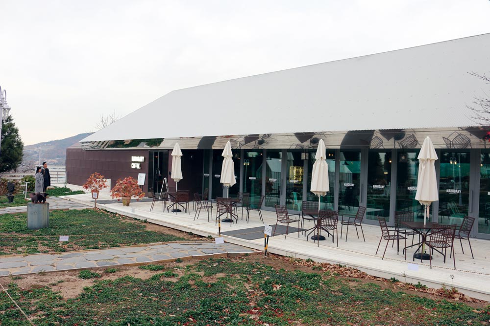 The site of mahogany cafe which is newly stood is located one step below the site, about 3 meters below the level, where the existing 'Dore-Dore' Cafe is located. It was designed of shape that the yard of mahogany cafe's front surrounds spatially to connect outdoor cafe and indoor cafe without any division. In order to protect summer sunlight, the eaves were designed long and the structure used the prefabricated lightweight steel. It was not trying to do any finishing to reveal prefabricated lightweight steel as it was, but it is something to feel sorry that the finishing was done considering indoor interior of cafe. The exterior was a simple shape of gable board, and was composed to contrary to the unique shape of the existing Dore-Dore cafe. The simpleness was more emphasized using a valley steel plate for the finishing. In order to emphasize the shape of plate which was made by bending and the bending at the front garden, the eaves of roof and edge portion was treated to project surrounding environment through stainless steel mirror finishing.