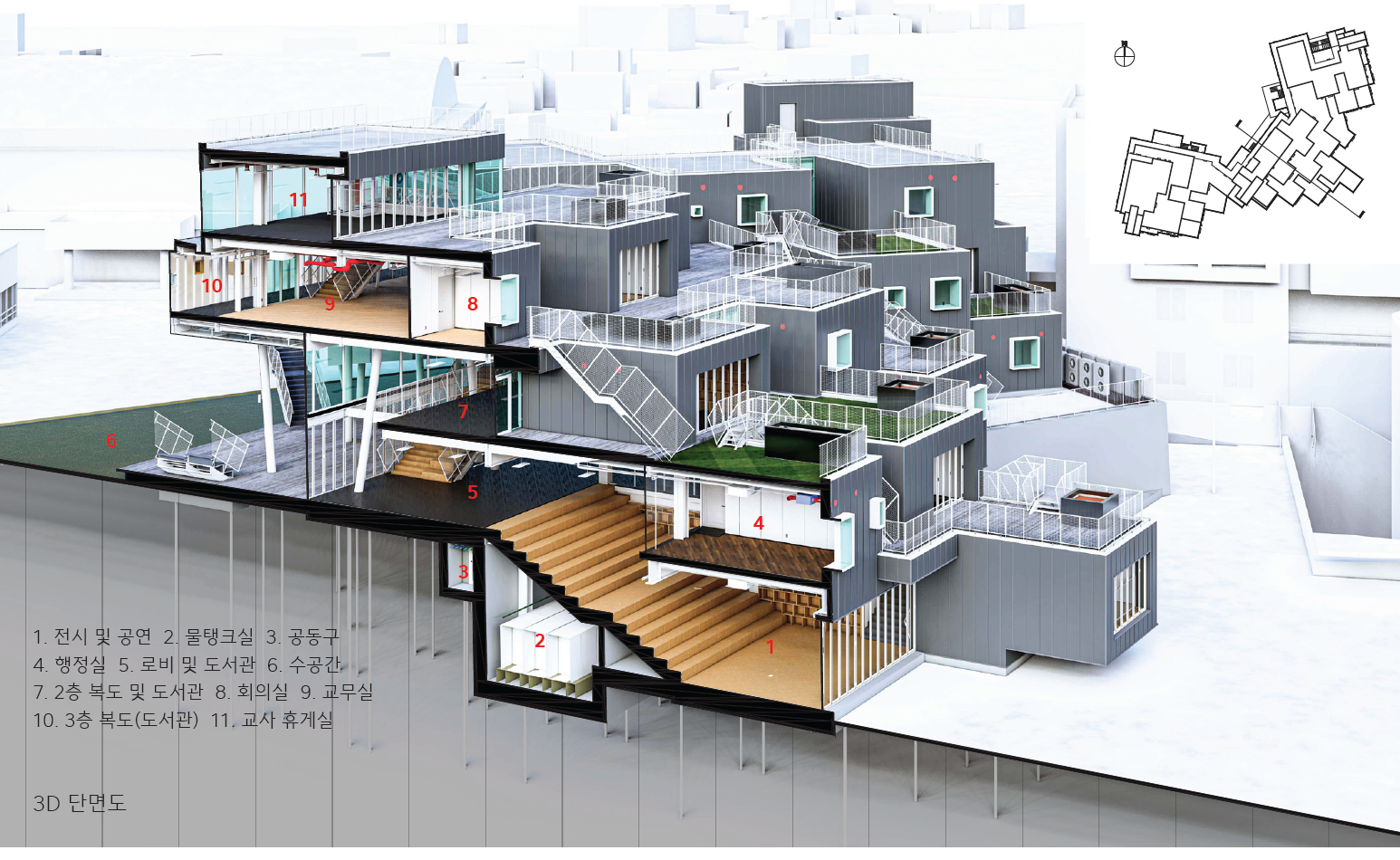 교실들을 모두 공중에 띄워 테라스 형태로 펼쳐서, 교육 공간을 수직 상하 체계가 아닌 수평 체계로 만들어 학년, 나이 구별 없는 공간으로 만들고, 그 아래에 고교학점제에 따른 홈베이스의 역할을 담당할 오픈형 도서관을 두었다. 공중교실들과 도서관의 입체적, 유기적 3차원적 연결은 학생들의 호기심과 창의성을 최대한 이끌어낼 것이다.
