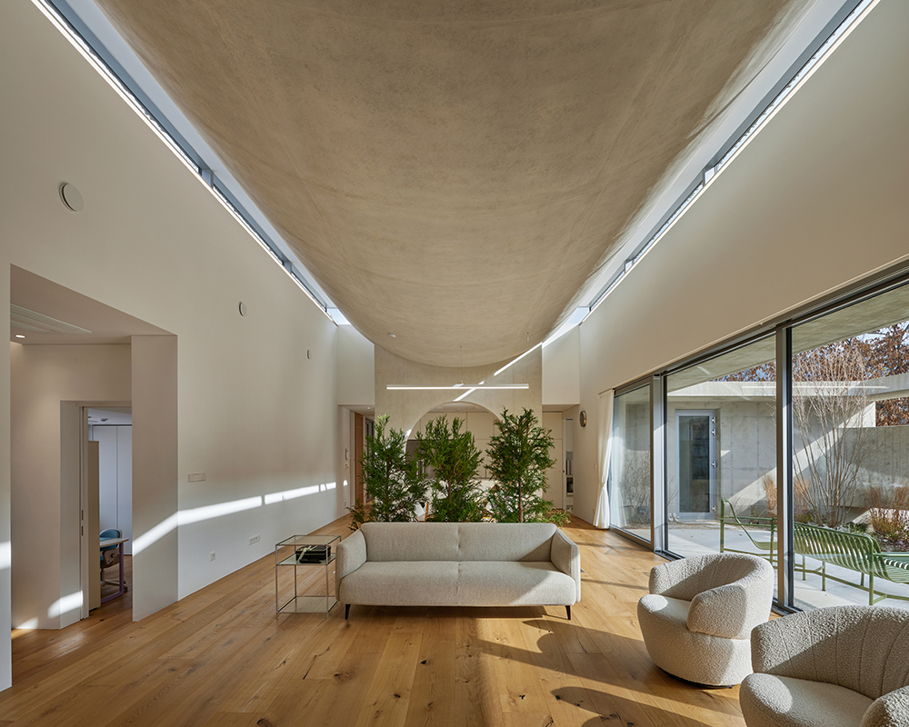 The project sought to create a sensory experience that captures the physicality of intangible elements like light, shadow, sound, seasons, and time. To maximize the connection between the house and nature, the structure was designed as a low-lying, single-story home that spreads across the expansive site. At the center of the large property, a symbolic family space was defined under a grand roof, which becomes the focal point for extending and integrating the internal and external spaces with the surrounding environment.