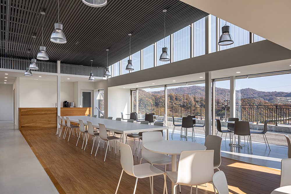 The Paul Factory is situated in an industrial complex surrounded by mountains. Despite not being legally required to have landscaping, we created three landscaped areas between the factory and the distant views to restore the original mountainous landscape. We overlapped the foreground and background with the architecture to create a visually harmonious composition. By adding visual elements such as distant mountains and diverse landscaping that reflect seasonal changes, we aimed to breathe life into an otherwise arid industrial environment. This design offers users of the space a sense of relaxation and tranquility amidst nature. The dining hall and café were also naturally connected through a courtyard, providing comfortable rest areas.