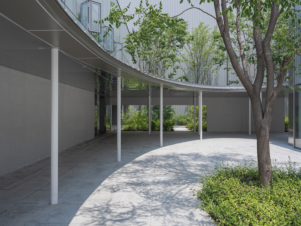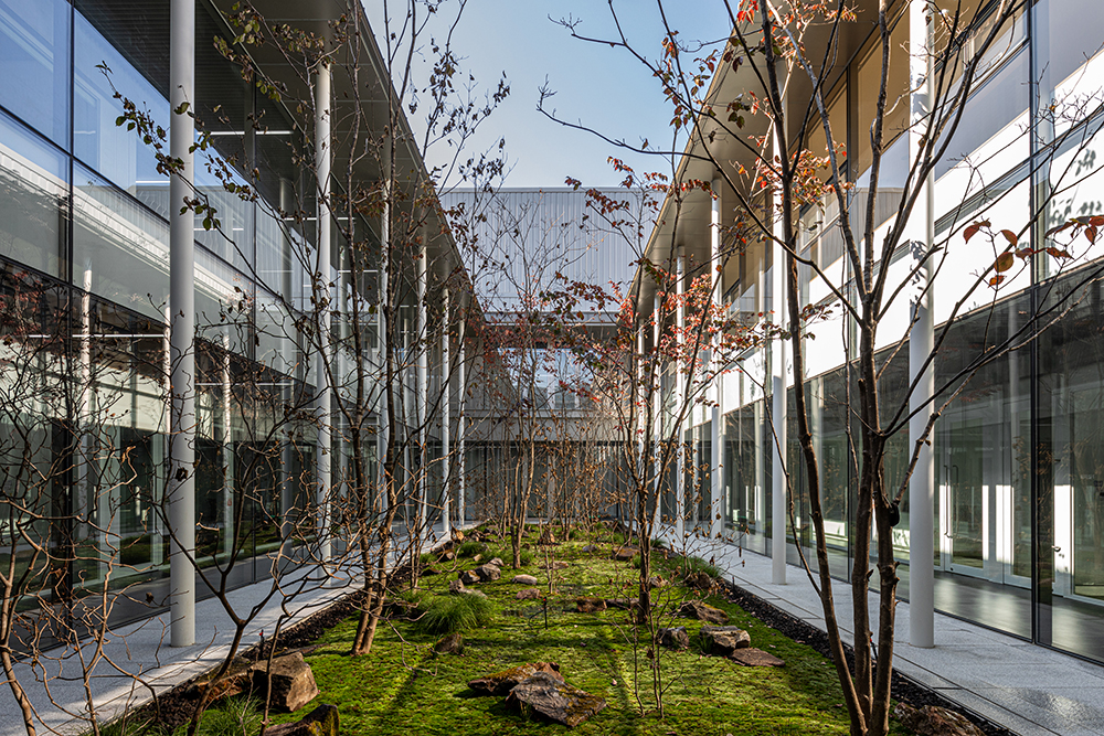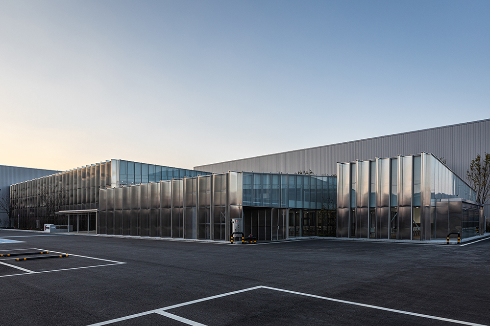 Manufacturing-based factories are typically divided into a main production building for manufacturing functions and an annex for offices and welfare facilities. The production building generally features a single large space to accommodate current processes and future expansion, making a significant visual impact on the landscape. The POLE Factory breaks away from this convention with a cluster of six large and small interconnected boxes. This design reflects the architect’s persistence in creating a flexible plan that can adapt to current demand fluctuations and future uncertainties, along with the client’s trust in and understanding of the architect’s vision. The architect organized the space by separating three production buildings, office and rest areas, a dining area, and a cafe, connecting them internally through corridors, external walkways, double-height voids, and courtyards, and unifying the exterior through a strategic outer skin that responds to broader environmental contexts. The landscape architect transplanted trees from the surrounding mountains, creating a distinctive environmental quality with a layered approach: a frontal landscape that welcomes varied functions and characteristics, gardens that foster walking and interaction, and a central courtyard that serves as a focal point in the daily rhythm of work and rest. The design does not attempt to make the factory appear non-industrial, nor does it adopt an ethical stance that places human spaces above machine spaces. Instead, it embraces a balanced approach that respects the unique rhythms of each element: the homogeneous time of machines, unaffected by day, night, or seasonal changes; the human need for intervals of focus and rest; and the slower, more enduring time needed by trees to settle and grow deeply. This thoughtful balance is embodied in the architecture of this exceptional factory.