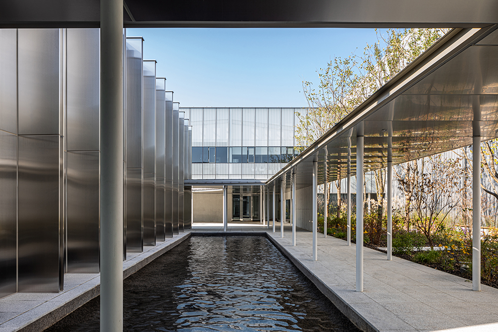 For the exterior of the building, we used stainless steel and aluminum. Inspired by the linear motion of materials like aluminum and nickel used in battery terminals, we incorporated these linear patterns onto the building’s surface. The deep stainless-steel louvers connect the various masses of the factory (administration, dining, and café areas) into a cohesive whole while allowing subtle differences in detail to give each mass its unique character. We extended these vertical patterns indoors by applying aluminum louvers to the ceilings, creating a consistent atmosphere throughout the space.