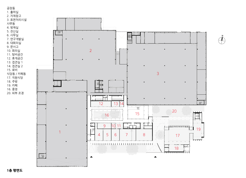 제조업 기반의 공장은 크게 생산 기능을 담는 공장동, 사무 및 복리시설을 담는 부속동으로 구분된다. 공장동은 현재 생산 공정뿐 아니라 향후 증설까지 대비해 단일 규모의 대공간을 취하고, 그래서 경관에의 영향은 지대하다. <POLE 공장>에서는 이러한 전형을 벗어난 크고 작은 여섯 개의 박스가 군집을 이루고 있다. 여기에는 현재 예측 가능한 수요 변동과 미래의 불확실성에도 계획안이 유연하게 작동할 수 있음을 보여준 설계자의 집요함과 그 가치를 이해하고 설계자의 비전을 받아들인 건축주의 신뢰가 있다. 설계자는 세 개의 공장동, 사무와 휴게공간, 식당, 카페를 나누어 안으로는 복도와 외부 회랑, 이층 높이의 보이드와 중정으로 연결하고, 밖으로는 기능을 넘어 더 큰 맥락에 대응하는 외피의 전략으로 통합한다. 조경가는 공장이 위치한 지역의 산에서 옮겨온 나무들을 각기 다른 역할과 위치의 특성을 반기며 초대하는 전면 조경, 산책과 만남이 이루어지는 정원, 일과 쉼을 오가는 반복적 일상의 구심점으로서의 중정에 따라 이식해 고유한 환경적 퀄리티를 만들어 낸다. 공장을 공장이 아닌 것처럼 보이게 하는 미학이나, 기계의 공간보다 사람의 공간이 더 중요하다는 리얼리티를 부정하는 윤리적 태도를 취하지 않는다. 낮과 밤, 계절의 변화와 무관하게 균질한 기계의 시간과, 집중과 쉼의 리듬, 틈이 필요한 사람의 시간, 그리고 그 사이에 더 깊은 호흡과 더 긴 정착이 필요한 나무의 시간들을 대등하게 다루려는 설계자의 태도가 이 특별한 공장 건축에 담겨 있다.