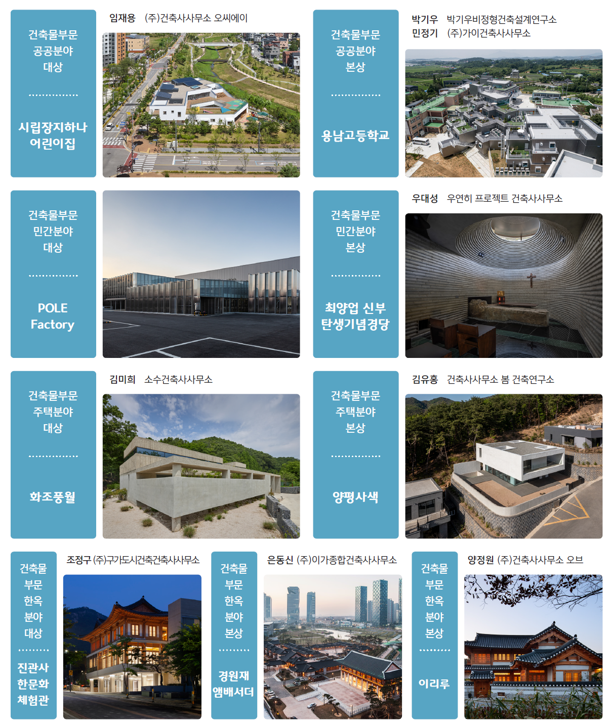 본상 부문에서는 공공분야에 ‘용남고등학교(설계자 민정기 건축사, 주.가이 건축사사무소·박기우, 박기우비정형건축설계연구소)’, 민간분야에 ‘최양업 신부 탄생기념경당(설계자 우대성 건축사, 우연히 프로젝트 건축사사무소)’, 주택분야에 양평의 ‘양평사색(김유홍 건축사, 건축사사무소 봄 건축연구소)’, 한옥분야에 ‘경원재 앰배서더(설계자 은동신 건축사, 주.이가 종합건축사사무소)’와 ‘이리루(설계자 양정원 건축사, 주.건축사사무소 오브)’가 각각 수상작으로 선정됐다. 각 수상작은 공간 구성과 지역성을 반영한 설계로 높은 평가를 받았다.