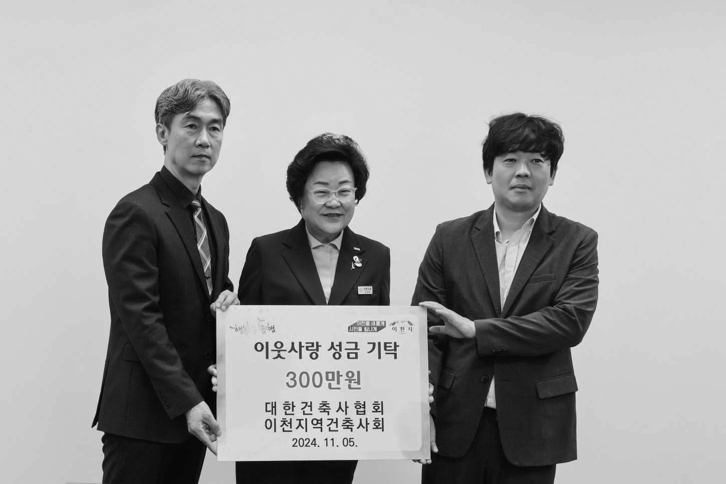 경기도건축사회 이천지역건축사회는 11월 5일 이천시가 진행하는 ‘행복한 동행’ 사업에 성금 300만 원을 기탁했다. 이천지역건축사회 김학식 회장은 "건축경기 및 지역경제가 침체된 상황에서 더욱 힘든 시간을 보내고 있을 지역사회 취약계층을 위해 기부하게 됐다"며 "지역사회 발전을 위해 꾸준히 함께 하며 기부금액을 늘릴 수 있도록 노력하겠다"고 밝혔다.