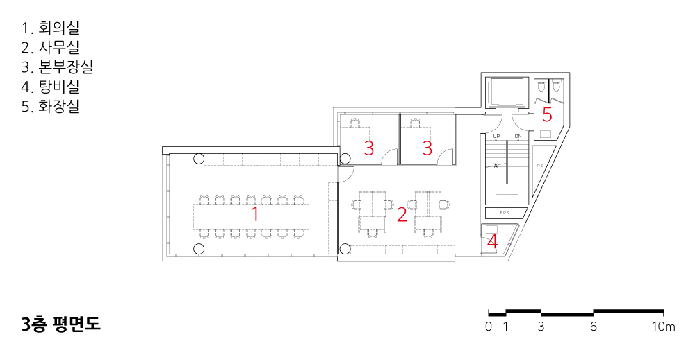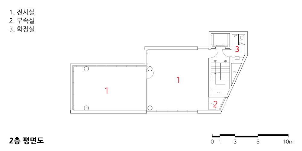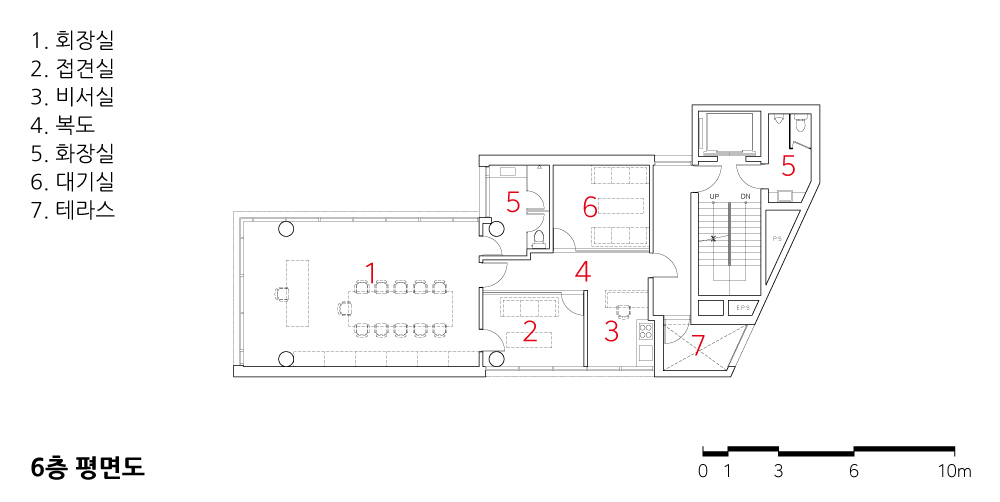 The basement level accommodates parking accessible from the rear road, the first floor features a café accessible from the main street, the second floor serves as an exhibition space, and the third to sixth floors contain office and meeting spaces. The concrete lining naturally adjusts to orientation, views, and sunlight according to the varying uses on each floor. In areas where the building’s shape alters the floor width, simply reversing the direction of the lining creates diversity in both internal space and façade. Although this concept is straightforward, various technical methods such as flat slab structures, post-tensioning techniques, gang form walls, steel & reinforced concrete columns, and exposed concrete finishes were utilized in its realization. The interior spaces were designed to expose various facilities and lighting on the ceiling, aligning with the architectural concept.