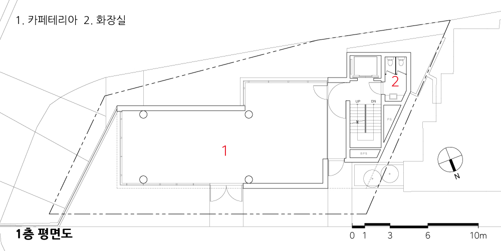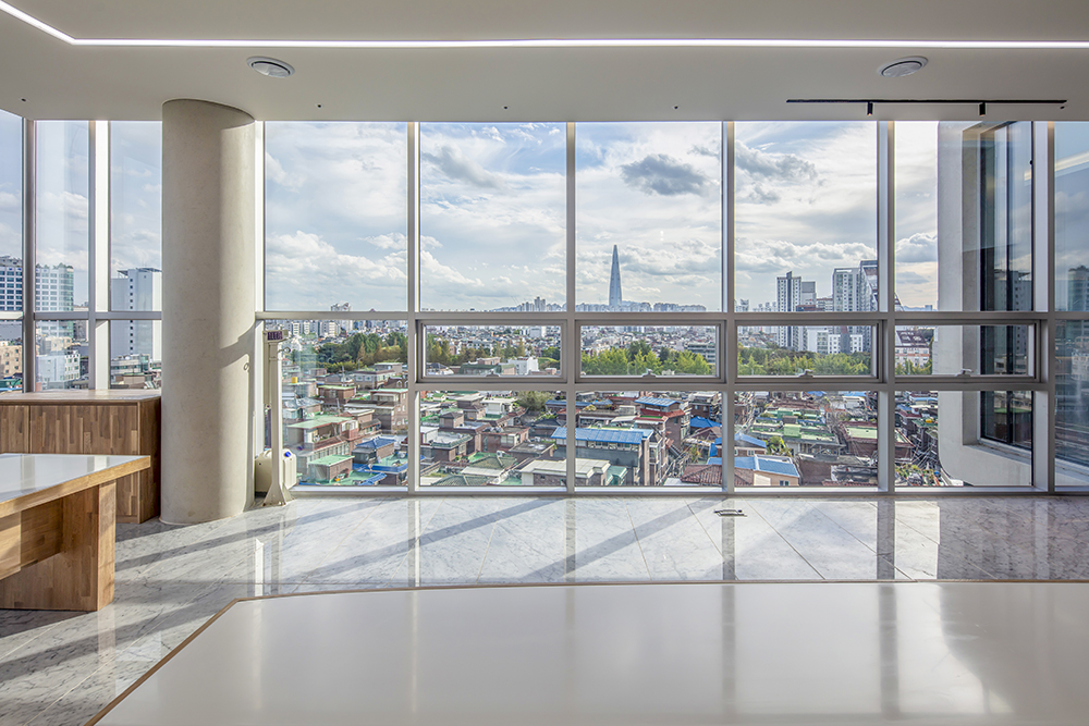 대지는 광진교 남단에 위치한 사다리꼴 형상의 땅으로 오랜 시간 개발되지 못하고 나대지로 방치되었던 곳이었다. ‘천호동 공구거리’라 이름 붙은 앞길의 풍경은 다소 번잡했지만, 건물이 올라가면 분명 멀리 아차산을 배경으로 한강 물이 흐르는 풍경이 그림처럼 보일 게 분명했다. 전면도로와 3.6미터 단차를 가진 이면도로는 별도로 땅을 더 파지 않고도 지하 주차장으로 쓰이기 용이한 구조였다. 이곳에 사옥을 짓기로 결심한 건축주는 지형을 그대로 활용해 공사비용과 기간을 최대한 줄여 빠른 시간 내 입주를 희망했다. 근린생활시설의 특성상 평면적으로는 법규와 경제적 논리가 많은 부분을 결정할 수밖에 없기에 입면과 재료적 표현에서 더 많은 고민을 필요로 했던 프로젝트였다.
