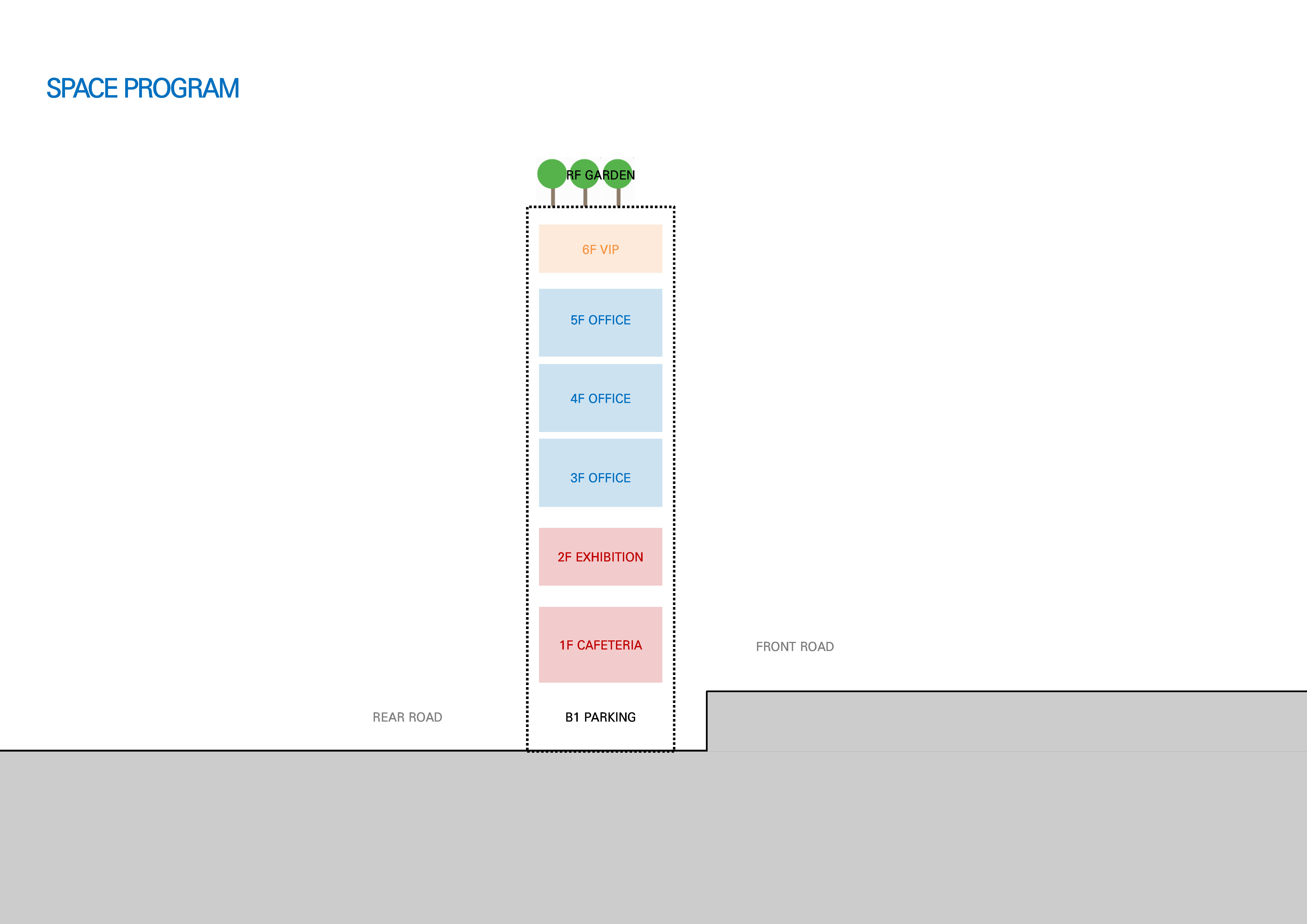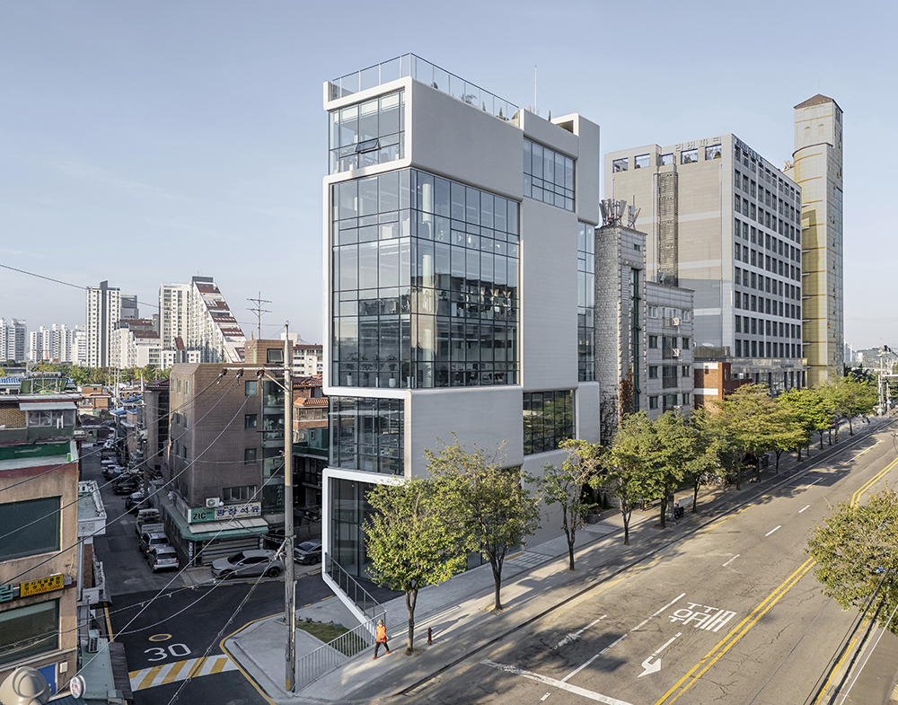 The site is located at the southern end of Gwangjin Bridge, on a trapezoidal plot that had long been left undeveloped. The road in front, known as “Cheonho-dong Tool Street,” is somewhat bustling, but once the building is completed, it will offer a picturesque view of the Han River framed by Achasan Mountain. The front and rear roads, with a 3.6-meter elevation difference, allow for easy underground parking without additional excavation. The client decided to build an office on this site, aiming to minimize construction costs and time by utilizing the existing terrain for a quick move-in. Due to the nature of neighborhood commercial facilities, the floor plan was significantly influenced by regulations and economic factors, requiring careful consideration of the façade and material expression.