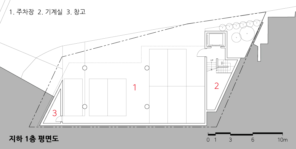 ‘콘크리트 라이닝(Concrete Lining)’은 터널 공사 시 가장 안쪽에 시공되는 콘크리트 구조물을 일컫는 용어다. 일정한 두께로 매끈한 곡면을 형성하는 콘크리트 부재는 그 자체로 터널의 구조이자 마감이고 곧 내부 공간을 규정하는 유일하고도 고유한 매개체다. 설계 과정 중 자진해 지하 터널공사 현장들까지 답사해 가며 건축주와 그 회사에 대해 공부했다. 그러고는 곧 콘크리트 라이닝의 매력에 매료되어 이를 사옥의 건축으로 담아내고자 결심하기에 이르렀다. 대지에서 솟아오르듯 시작되는 450밀리미터 두께의 노출콘크리트 구조체는 바닥, 벽, 천장을 넘나들며 전 층의 모든 공간을 아울러 규정한다. 이러한 행태는 건물의 측면에서 그대로 노출되어 마치 터널의 단면을 보는 듯한 착각마저 불러일으키며, 그 자체로 회사의 정체성에 대한 상징이자 다른 건물들과 차별화하는 디자인이며 건축의 공간 구성 원리를 솔직하게 드러내는 수단이 된다.