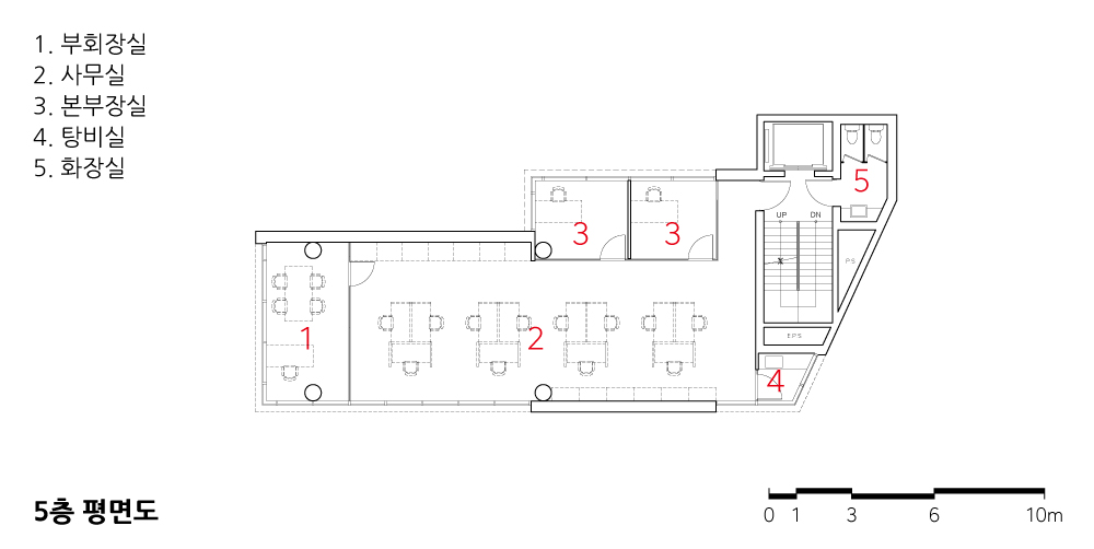 The site is located at the southern end of Gwangjin Bridge, on a trapezoidal plot that had long been left undeveloped. The road in front, known as “Cheonho-dong Tool Street,” is somewhat bustling, but once the building is completed, it will offer a picturesque view of the Han River framed by Achasan Mountain. The front and rear roads, with a 3.6-meter elevation difference, allow for easy underground parking without additional excavation. The client decided to build an office on this site, aiming to minimize construction costs and time by utilizing the existing terrain for a quick move-in. Due to the nature of neighborhood commercial facilities, the floor plan was significantly influenced by regulations and economic factors, requiring careful consideration of the façade and material expression.