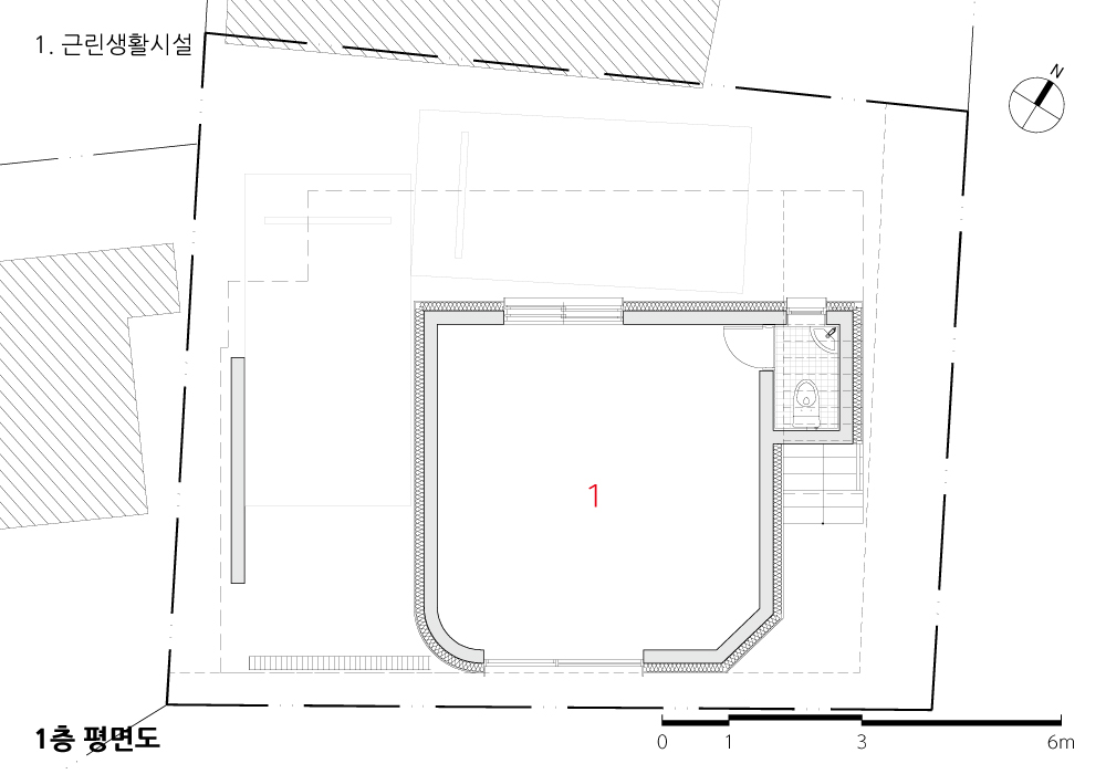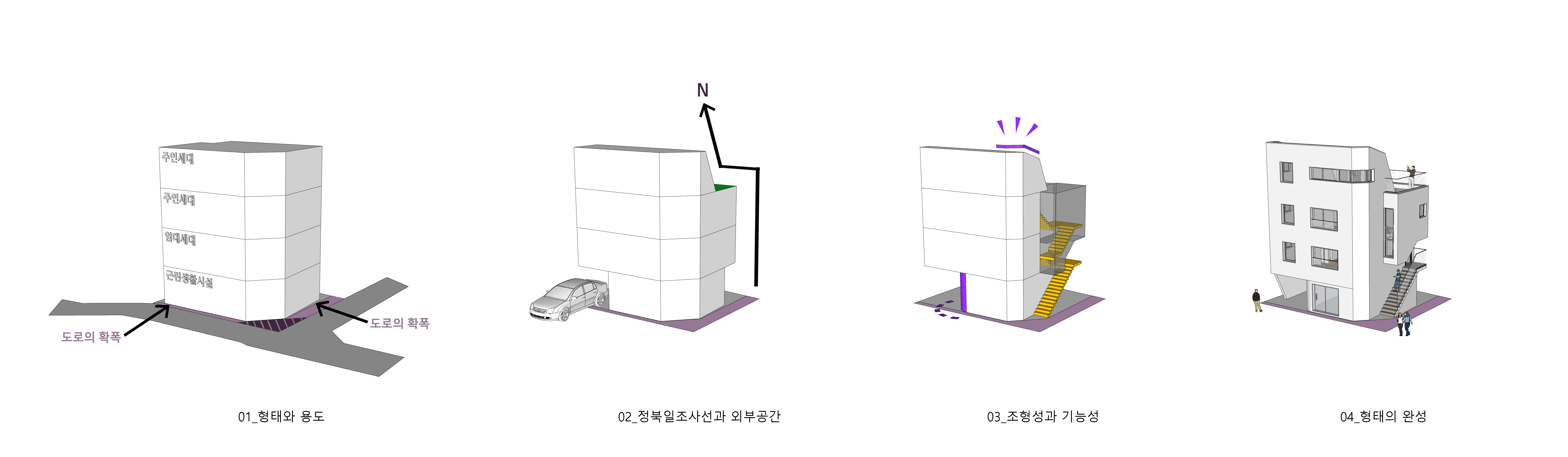 도로확보를 위해 후퇴한 계획 대지에서 법정 주차 2대를 계획하고, 1층 근린생활시설은 골목길에서 인지성을 높일 수 있도록 도로에 면해 출입구와 쇼윈도를 계획했다.