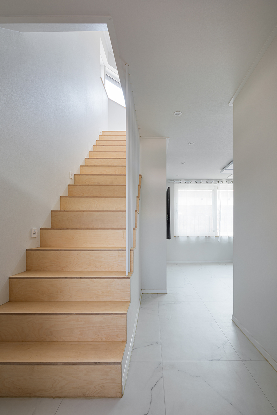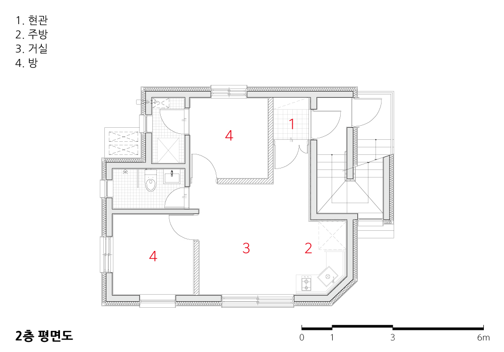 계획 당시 건축주가 수익성이 있는 다가구주택을 원해, 2층 공간은 두 개의 방과 거실/주방이 있는 작지만 아늑한 공간을 계획하여 신혼부부 및 젊은 세대를 맞이할 공간을 준비했다. 1층에서 출입하는 공용계단 부분을 도로변에서 쉽게 접근할 수 있도록 배치했고, 계단 하단 부분은 1층 실내화장실 공간이 될 수 있도록 계획했다.