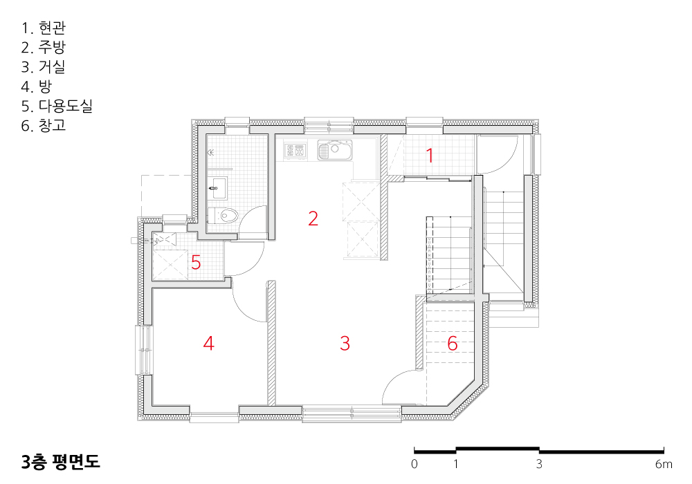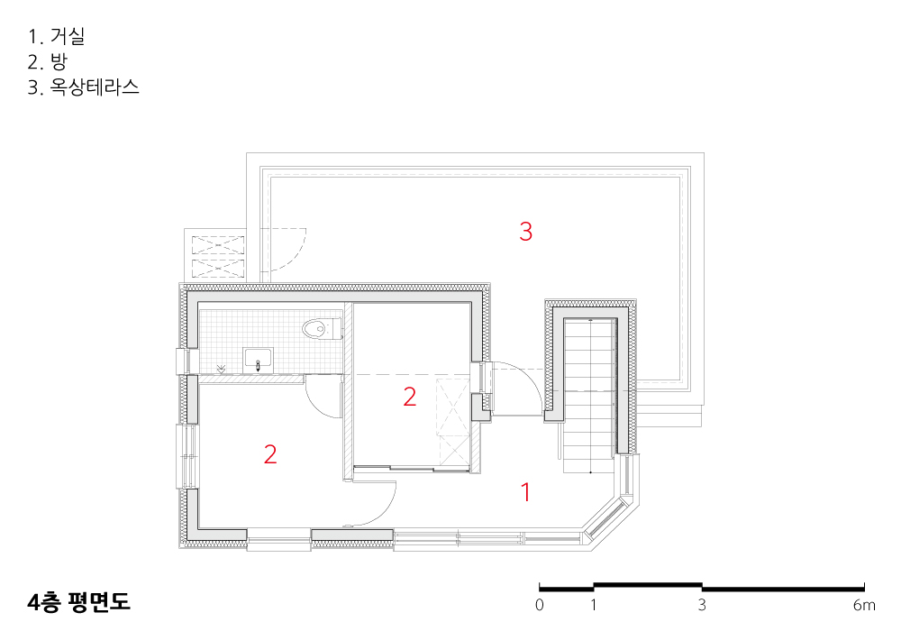 독립성이 확보된 4층 공간 구성, 주생활 공간의 남향 배치, 효율성을 고려한 주방과 거실 공간 등 가족들의 니즈 반영을 위해 많은 대안이 검토됐다. 협소주택은 수직 동선의 위치와 형태에 따라 평면구성에 많은 영향을 주기 때문에, 좁은 공간 활용의 극대화를 위해 다방면의 검토가 필요했다. 외부로부터 이어지는 수직 동선은 3층에서 내부로 가져와 주인세대만이 사용하는 내부계단이 되었고, 이는 가끔 방문하는 손주의 즐거운 놀이터가 되었다.