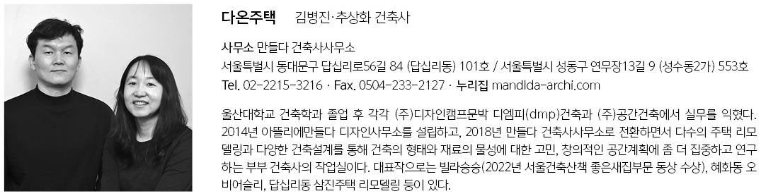 | 다온주택 설계자 | 김병진 · 추상화 _ 만들다 건축사사무소 건축주 | 전준모, 김영숙 감리자 | 박용걸 _ 건축사사무소 지선 시공사 | (주)보이드종합건설 설계팀 | 최유진 설계의도 구현 | 만들다 건축사사무소 대지위치 | 서울특별시 중랑구 용마산로 115길 77-16 주요용도 | 다가구주택, 제2종 근린생활시설 대지면적 | 92.16㎡ 건축면적 | 55.23㎡ 연면적 | 162.68㎡ 건폐율 | 59.93% 용적률 | 176.52% 규모 | 4F 구조 | 철근콘크리트구조 외부마감재 | 롱브릭 타일(두라스텍 S500타일), 유로폼 노출콘크리트 내부마감재 | 실크벽지, 비닐장판마감 설계기간 | 2022. 04 – 2022. 10 공사기간 | 2022. 12 – 2023. 11 사진 | 김창묵 구조분야 | 제일구조연구소 기계설비·전기·소방분야 | 세원엔지니어링(주) |