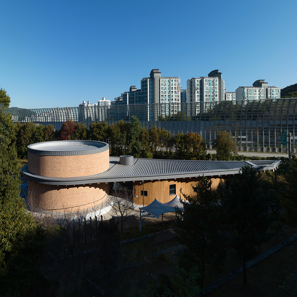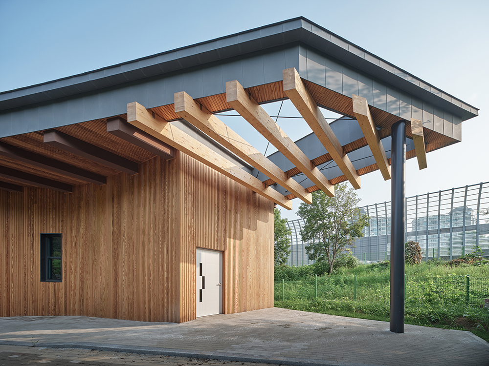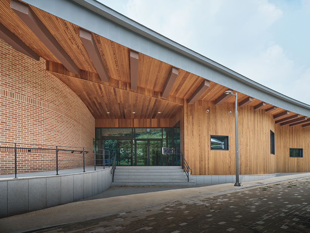 The entrance to the training center faces the Gi Hyeong-do Poetry Trail, a pathway within the park, enhancing accessibility and establishing the facility as a new cultural destination for visitors. The outdoor landscaping seamlessly connects to the surrounding park, creating diverse and harmonious scenic views that integrate with the natural environment.