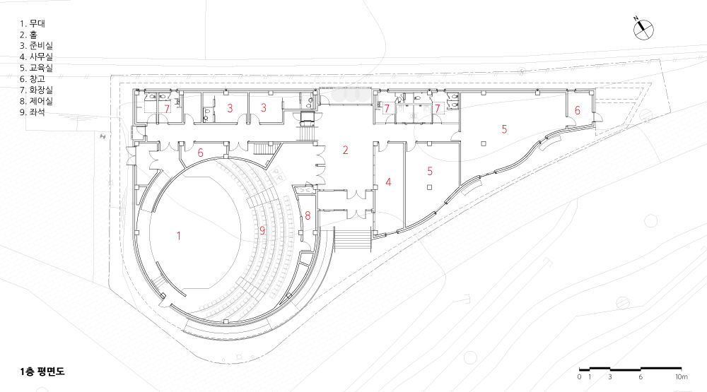 평면은 좌우로 긴 형태이다. 부지 둥근 부분에 큰 면적인 공연장을 배치하고 중앙 홀을 중심으로 좌측은 공연장과 대기실, 우측은 연습실 및 사무공간과 교육공간으로 구성된다. 공연장은 반원형의 아담한 무대와 150석 규모의 객석을 갖추고 있다. 무대와 객석의 거리가 가까워 그만큼 연희자와 관객이 함께 호흡하기에 최적화되어 있는 공연장이다. 한편 다양한 프로그램을 흡수할 수 있는 층고가 높은 공연장으로 계획해 지역사회의 문화 중심공간으로 활용될 수 있도록 구성했다. 중앙홀의 커다란 원형천창은 채광을 위해 중요한 역할을 담당한다. 이로 인해 협소하지만 답답해 보이 지 않고 공간적으로 다양하고 흥미로운 시선 관계를 가질 수 있도록 했다.